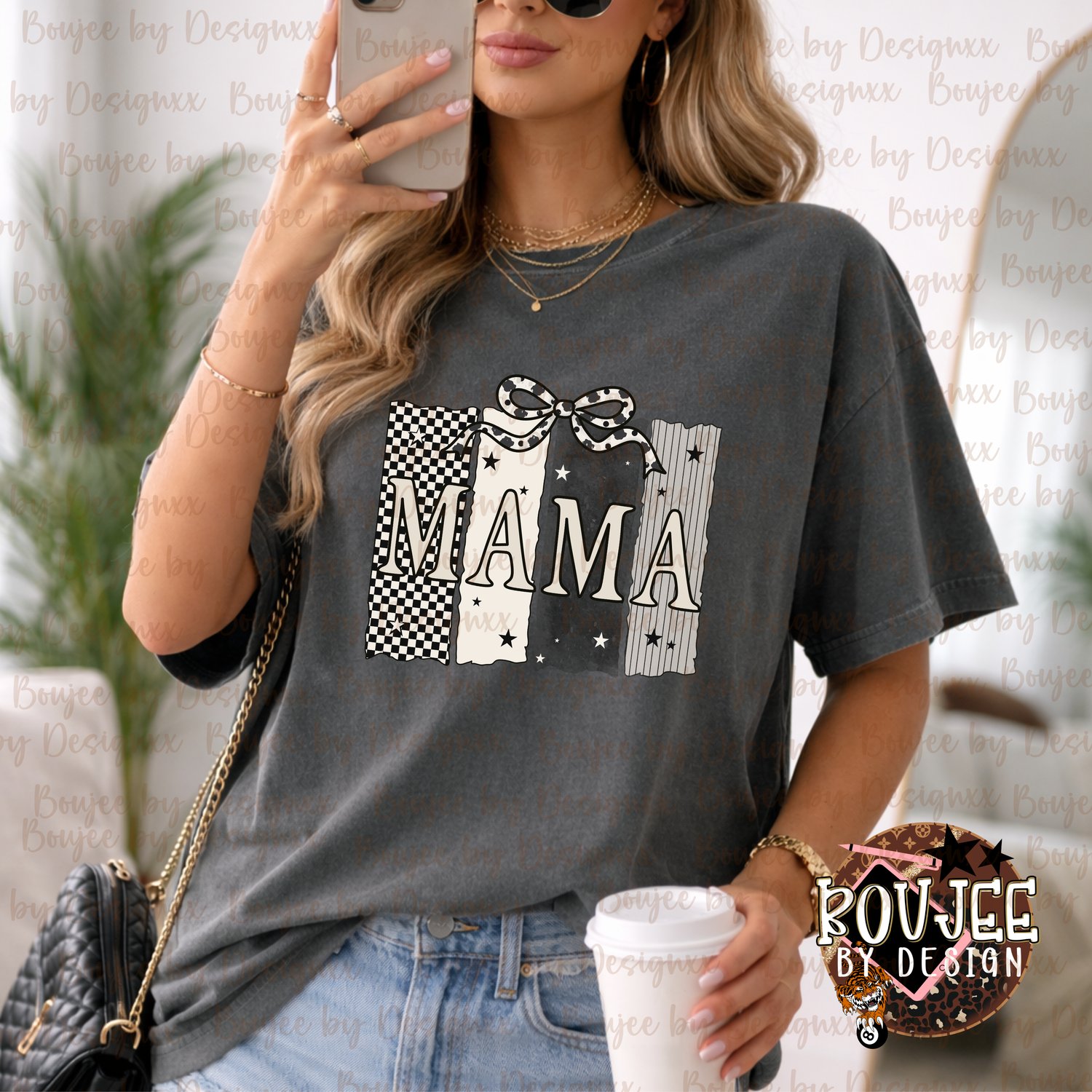 Featuring a trendy mix of checkerboard, stars, and soft neutral textures with a hand-drawn bow detail — this design gives elevated boutique vibes while staying minimal and modern.