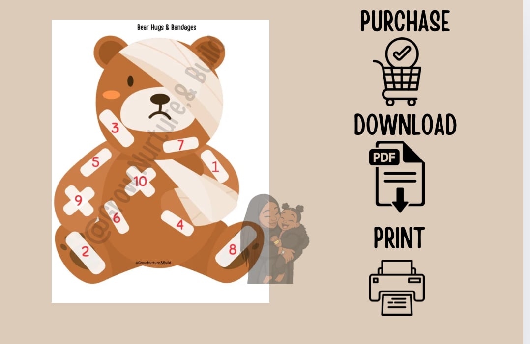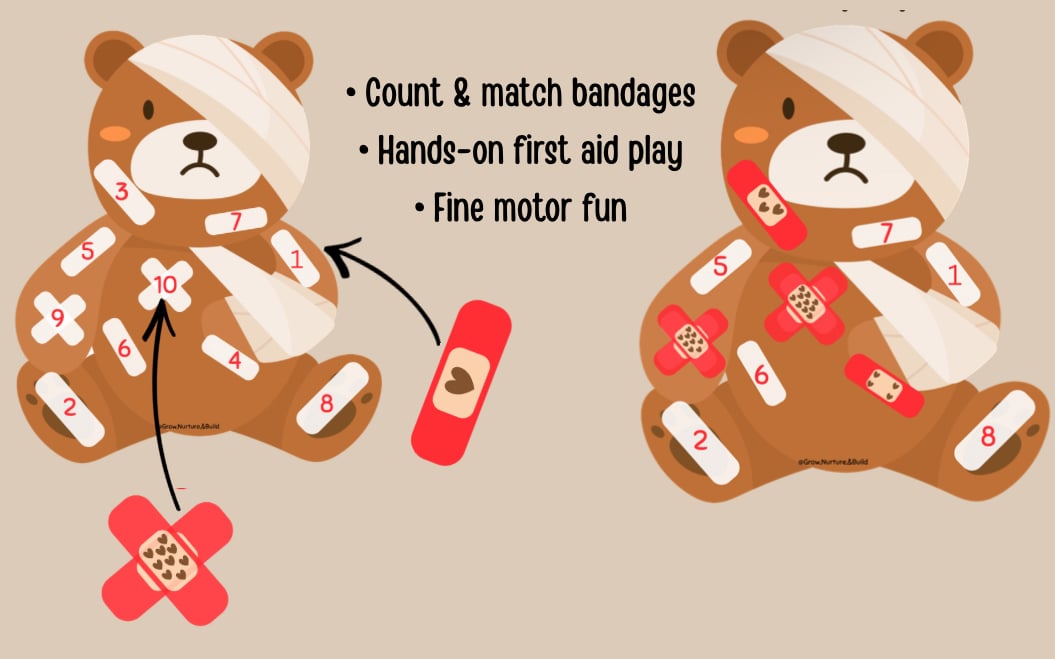 Bear Hugs & Bandages is a hands-on toddler activity that supports empathy, emotional awareness, and pretend play through a gentle first-aid theme. Little learners help care for their bear by cleaning scratches, matching bandages, and offering comfort.