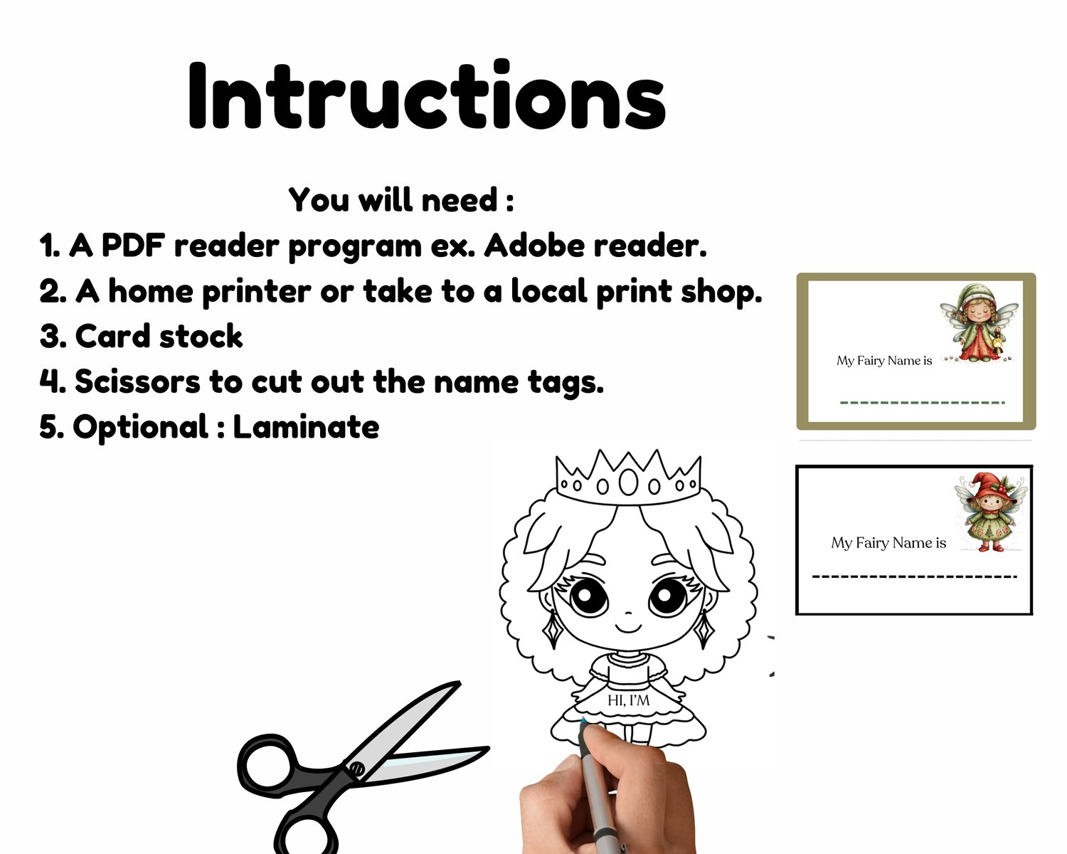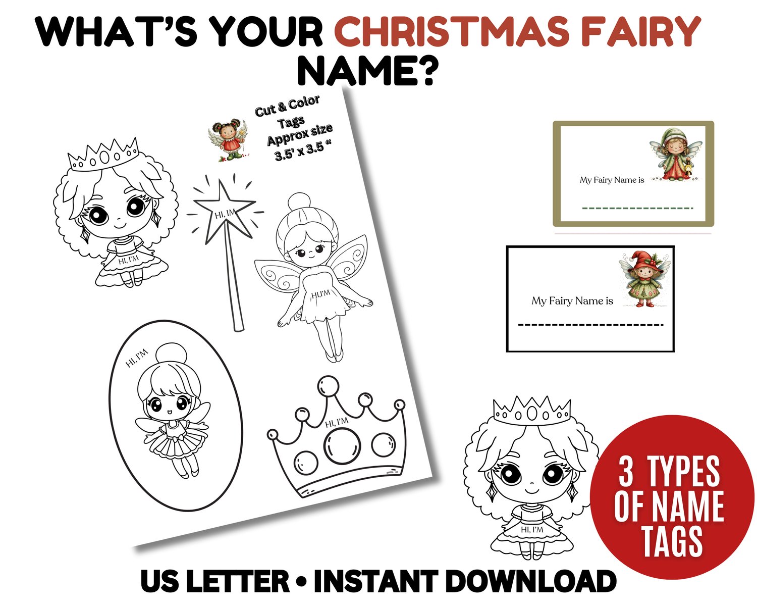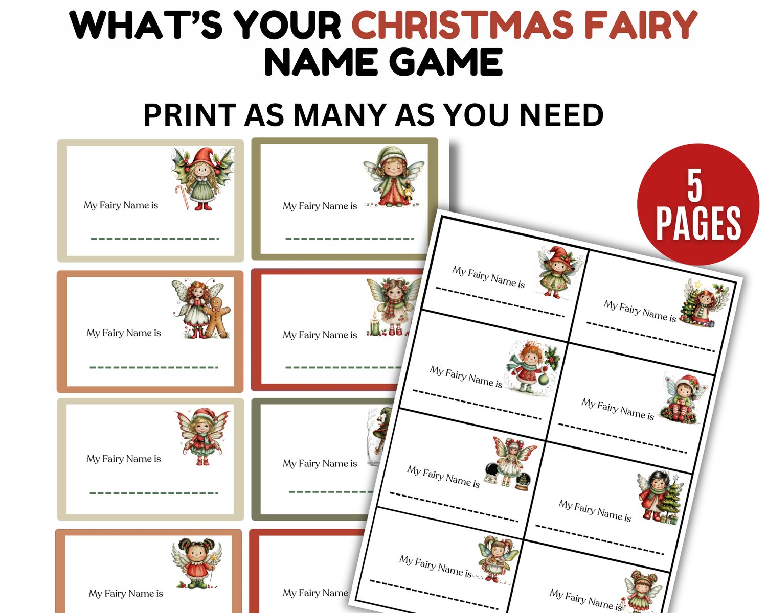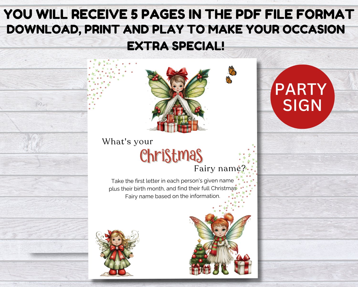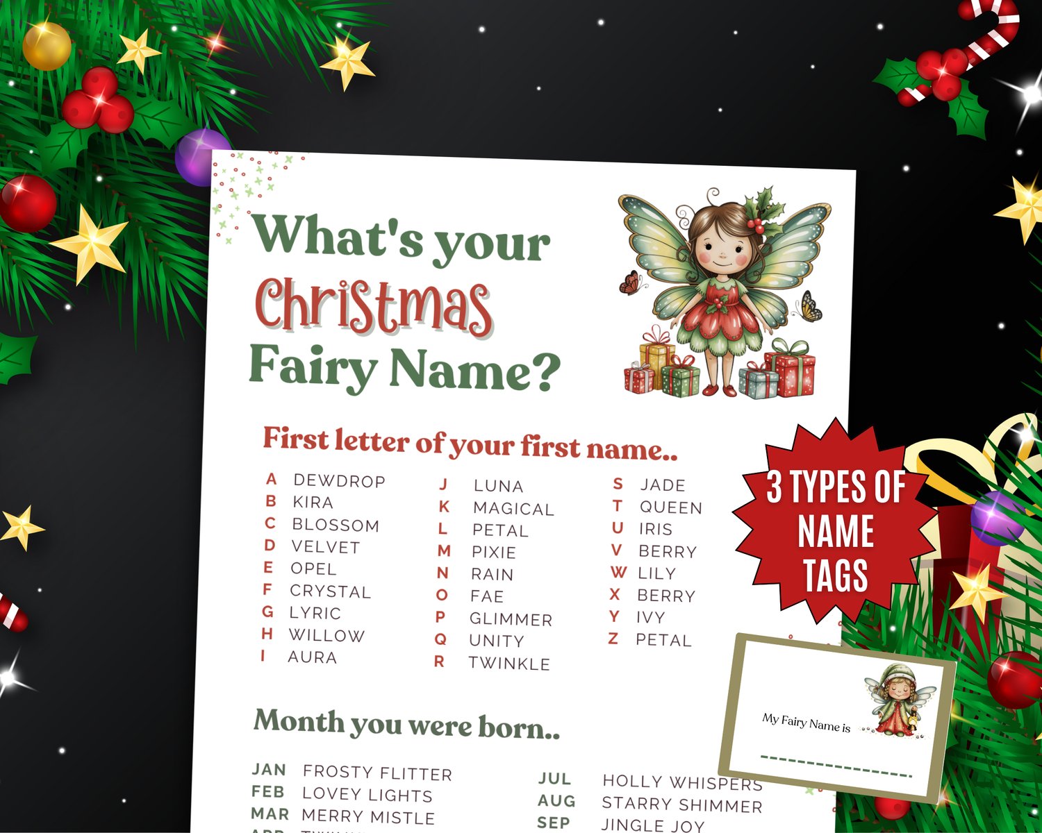 1 X PDF (5 Pages): includes 1 Christmas Fairy Name Generator, 3 name tag templates, and 1 x Party Sign.