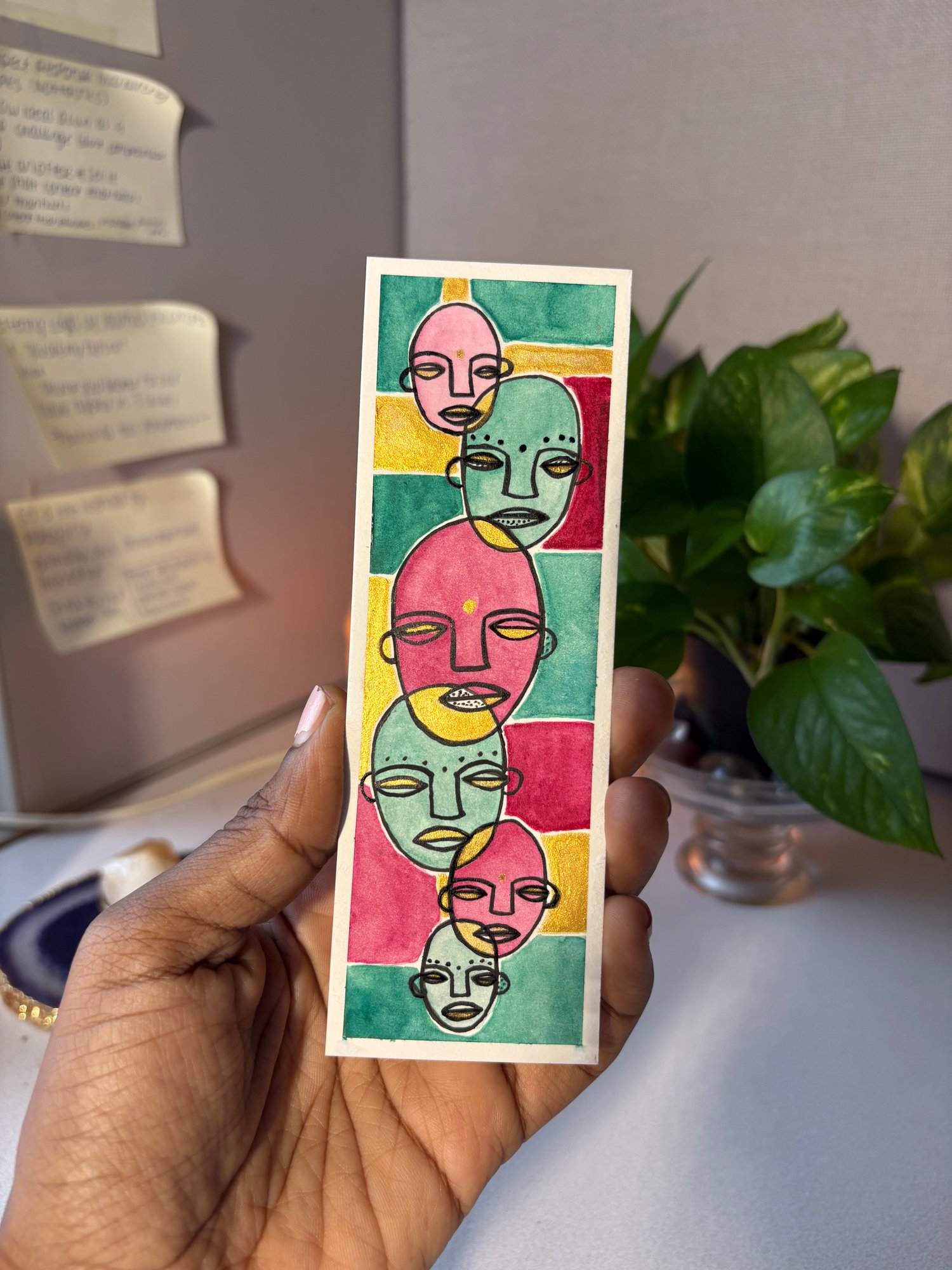 This bookmark is a one-of-a-kind piece, painted by hand in a rich red and rich green with soft gold accents. The meditative faces came to me during my own meditation practice.