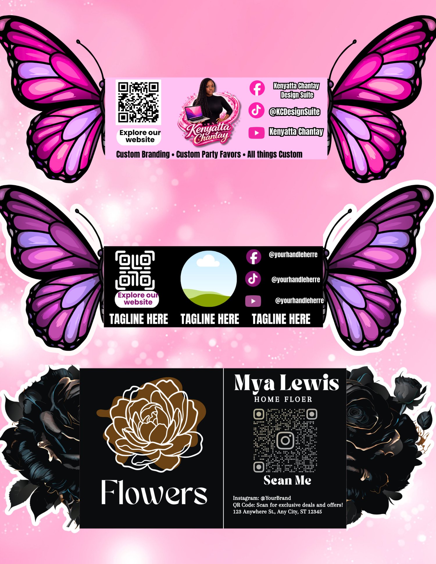 This bundle includes 12 fully customizable folded card designs — including butterflies, cakes, donuts, florals, and modern social-style layouts — plus 2 “Create Your Own” layouts so you can build a custom concept from scratch.