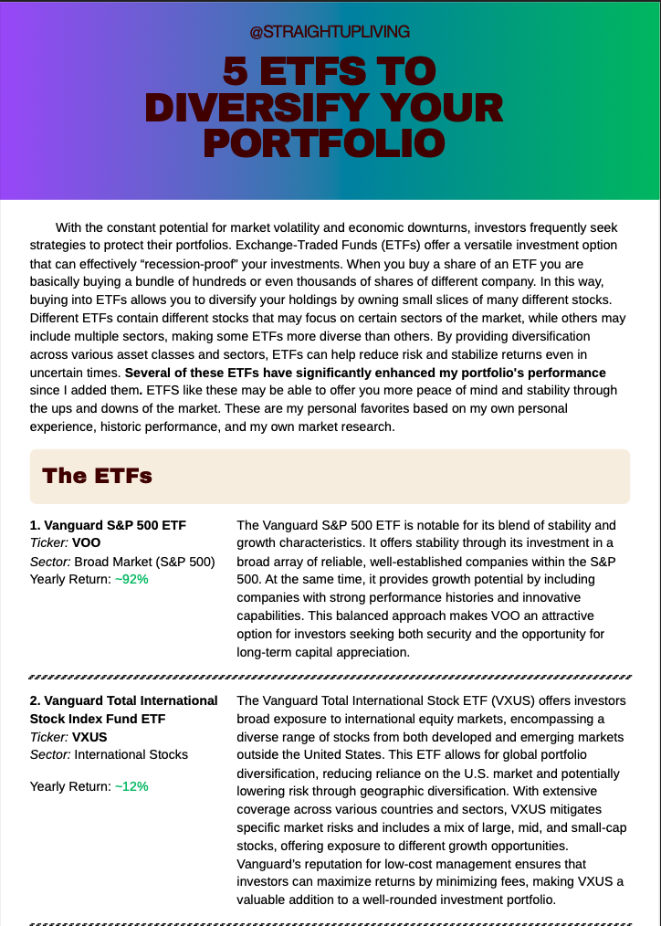The beauty of ETFs is that they allow investors to capture total market growth instead of trying to predict winning stocks. With the constant potential for market volatility and economic downturns, investors frequently seek strategies to protect their portfolios. Exchange-Traded Funds (ETFs) offer a versatile investment option that can effectively “recession-proof” your investments. When you buy a share of an ETF you are basically buying a bundle of hundreds or even thousands of shares of different company. In this way, buying into ETFs allows you to diversify your holdings by owning small slices of many different stocks. Different ETFs contain different stocks that may focus on certain sectors of the market, while others may include multiple sectors, making some ETFs more diverse or high risk than others. By providing diversification across various asset classes and sectors, ETFs can help reduce risk and stabilize returns even in uncertain times. Several of these ETFs have significantly enhanced my portfolio's performance since I added them. ETFS like these may be able to offer you more peace of mind and stability through the ups and downs of the market. These are my personal favorites based on my own personal experience, historic performance, and my own market research.