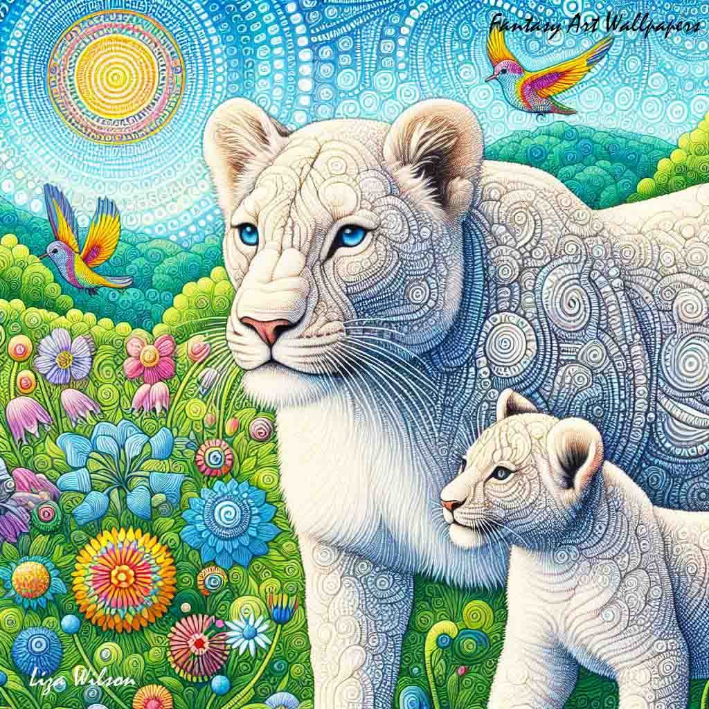 White lioness & cub on hills with wild flowers, Spirograph style.
