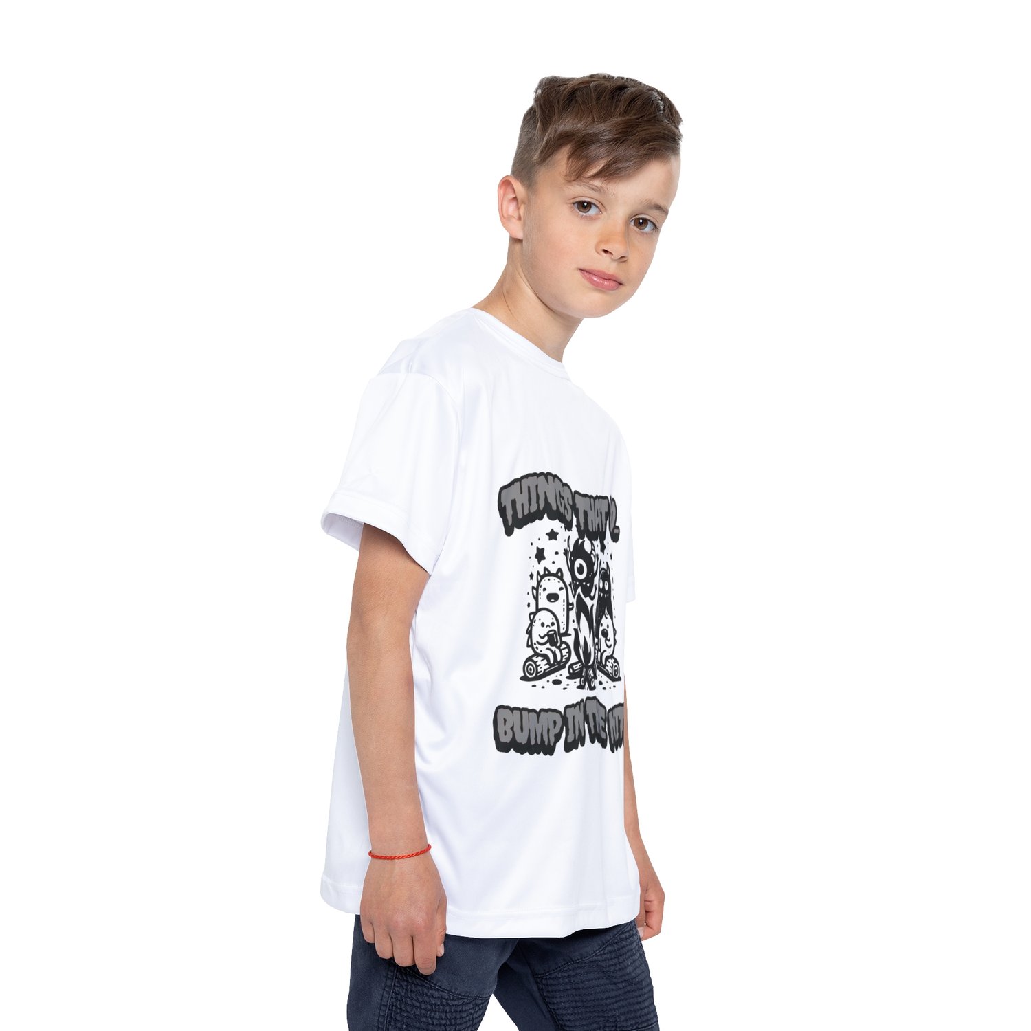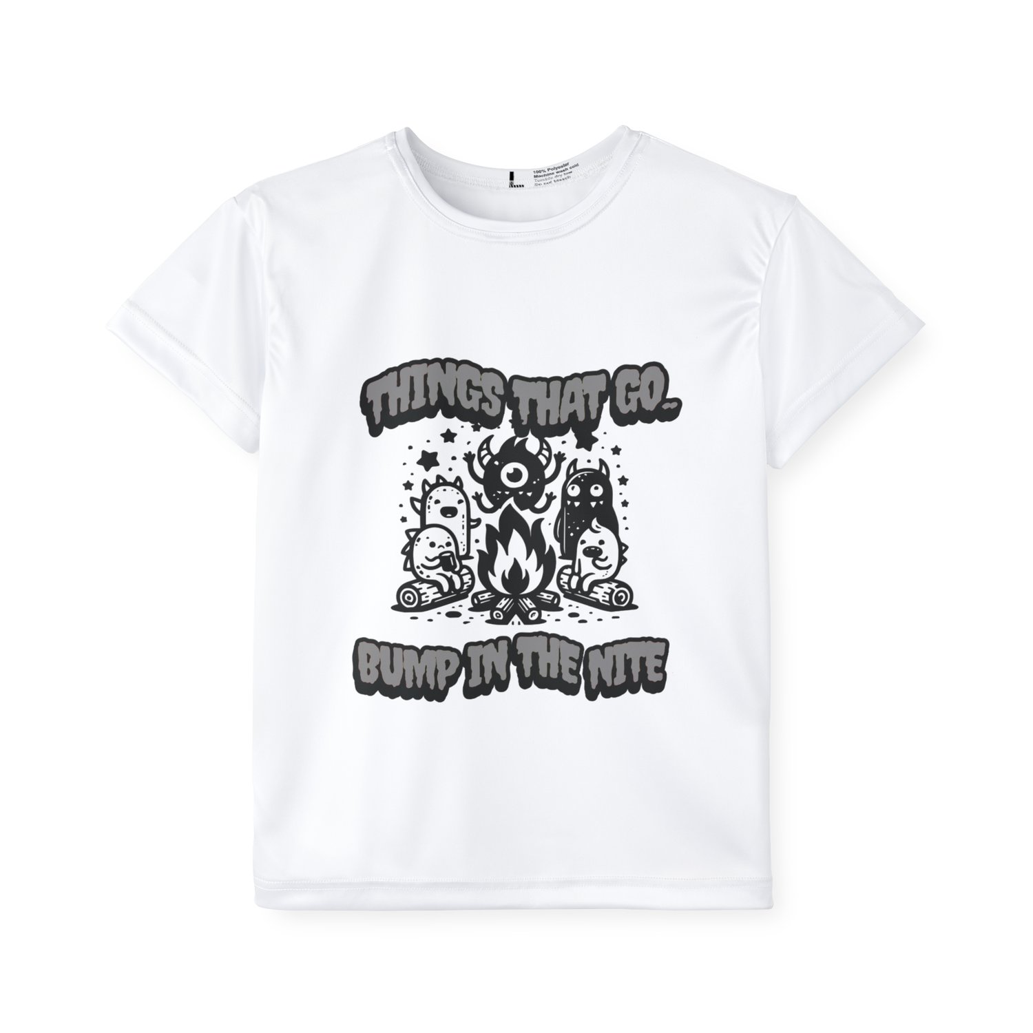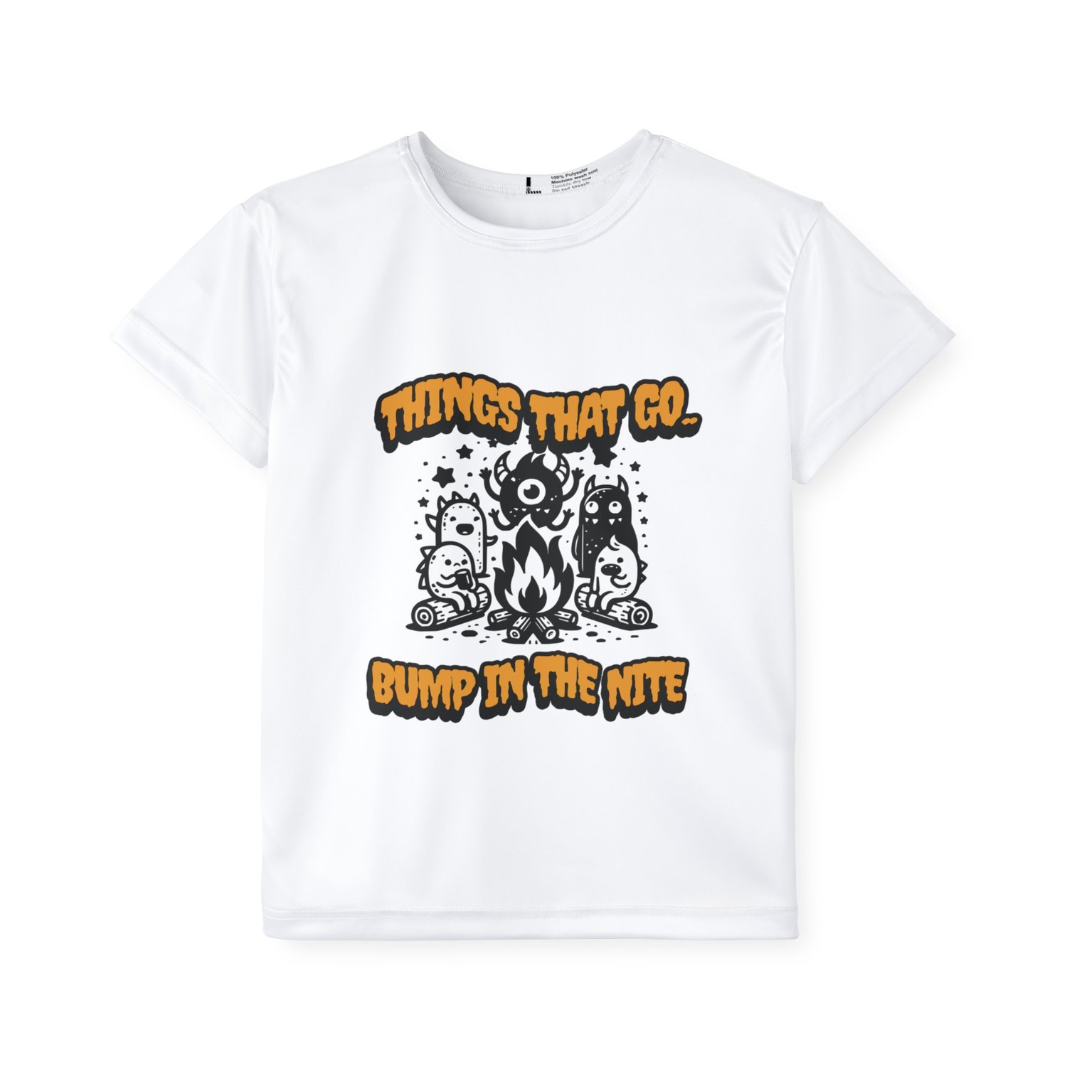 Fun and spooky boys t-shirt featuring little monsters around a campfire at night with the quote 'things that go bump in the night'. Perfect for young boys who love imaginative play and storytelling. Ideal for Halloween or camping trips.