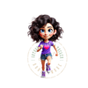 - Vibrant Appearance: Caucasian with shoulder-length black curly hair, sparkling blue eyes, a purple t-shirt featuring a heart emoji, pink denim shorts, and purple sneakers – a look kids love and remember.