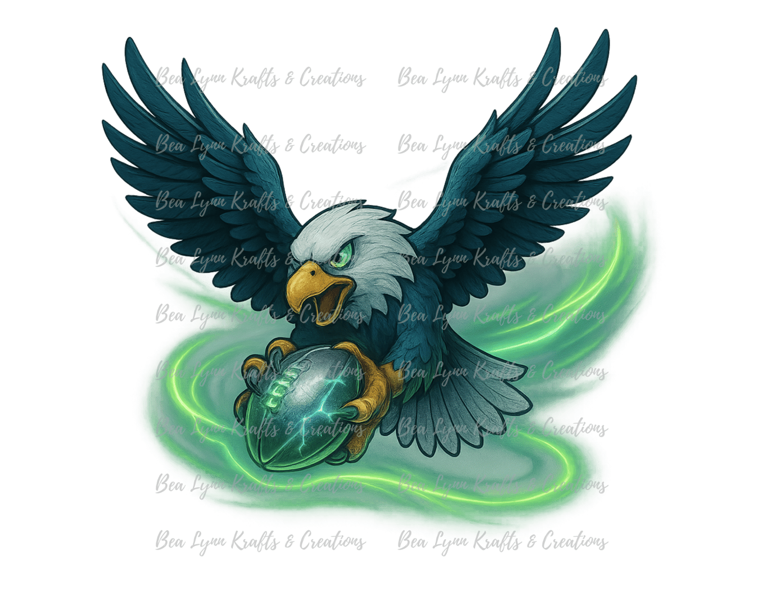 Ultra-realistic cartoon Philadelphia Eagles mascot flying forward with wings spread wide while gripping a glowing football. High-energy, merch-ready sports design perfect for shirts, tumblers, stickers, posters, and more. Digital download only – no physical item will be shipped.