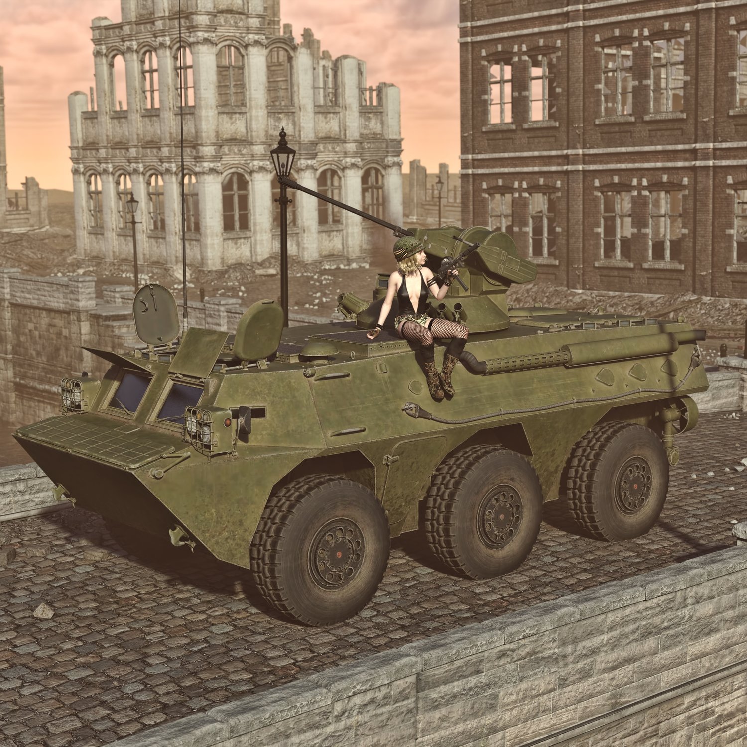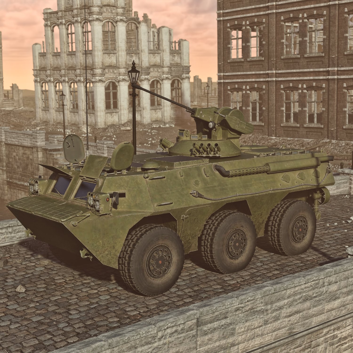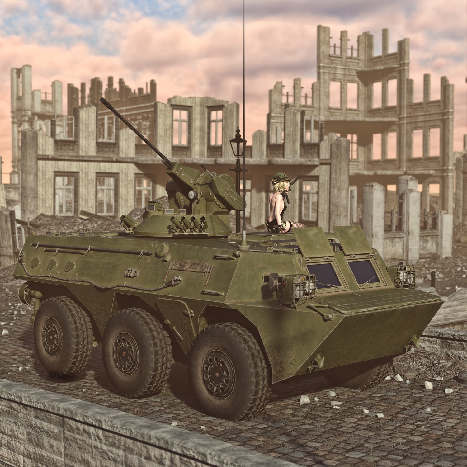 BMP- and Armored Infantry Vehicle. Made for transferring troops and provide cover with a heavy machine gun (and a small side gun). Heavier than an armored car, but not a tank. Rear door rigged for fast dismount from the back. Side doors also can be open for dismount and engine access. Good for transportation and for combat with lightly armored enemies. You can also take your friends with you- it has some space. Has internals and rear space for troops, but it's very limited. Turret and gun also rigged for good positioning. Windows covers and front hatches can also be opened. Converted and rigged for DAZ.