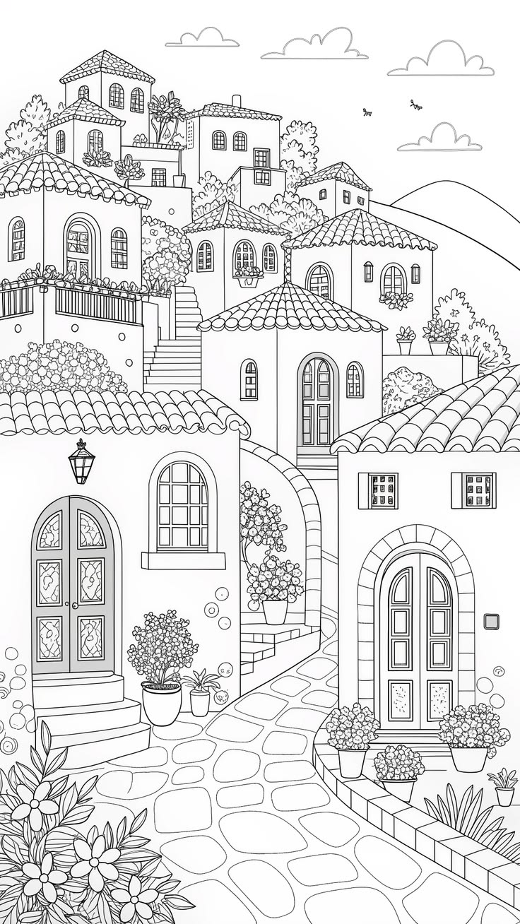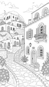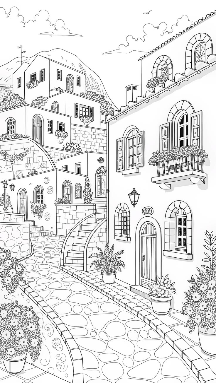Greek Village Architecture Coloring Book for Adults: 50 Relaxing Pages of Mediterranean Island Life, Santorini Streets, and Coastal Scenery | Printable PDF Digital Download