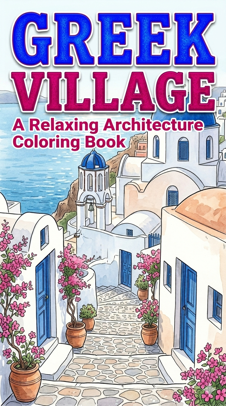 Welcome to Greek Village: A Relaxing Architecture Coloring Book. This collection features 50 hand-crafted illustrations that capture the timeless soul and breathtaking beauty of the Greek Islands. From the clifftop vistas of Santorini to the quiet, flower-filled corners of a hidden Mediterranean village, every page is a gateway to tranquility.