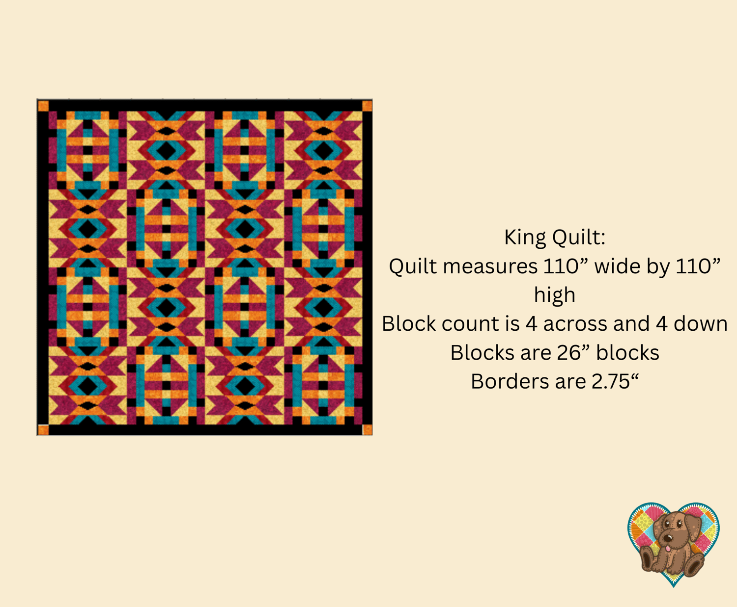 *Note: This pattern includes instructions for a lap (64.5" X 64.5"), twin (75.75" X 90"), queen (90" X 107"), and king (110" X 110") size quilt. * Blocks are traditional pieced blocks.