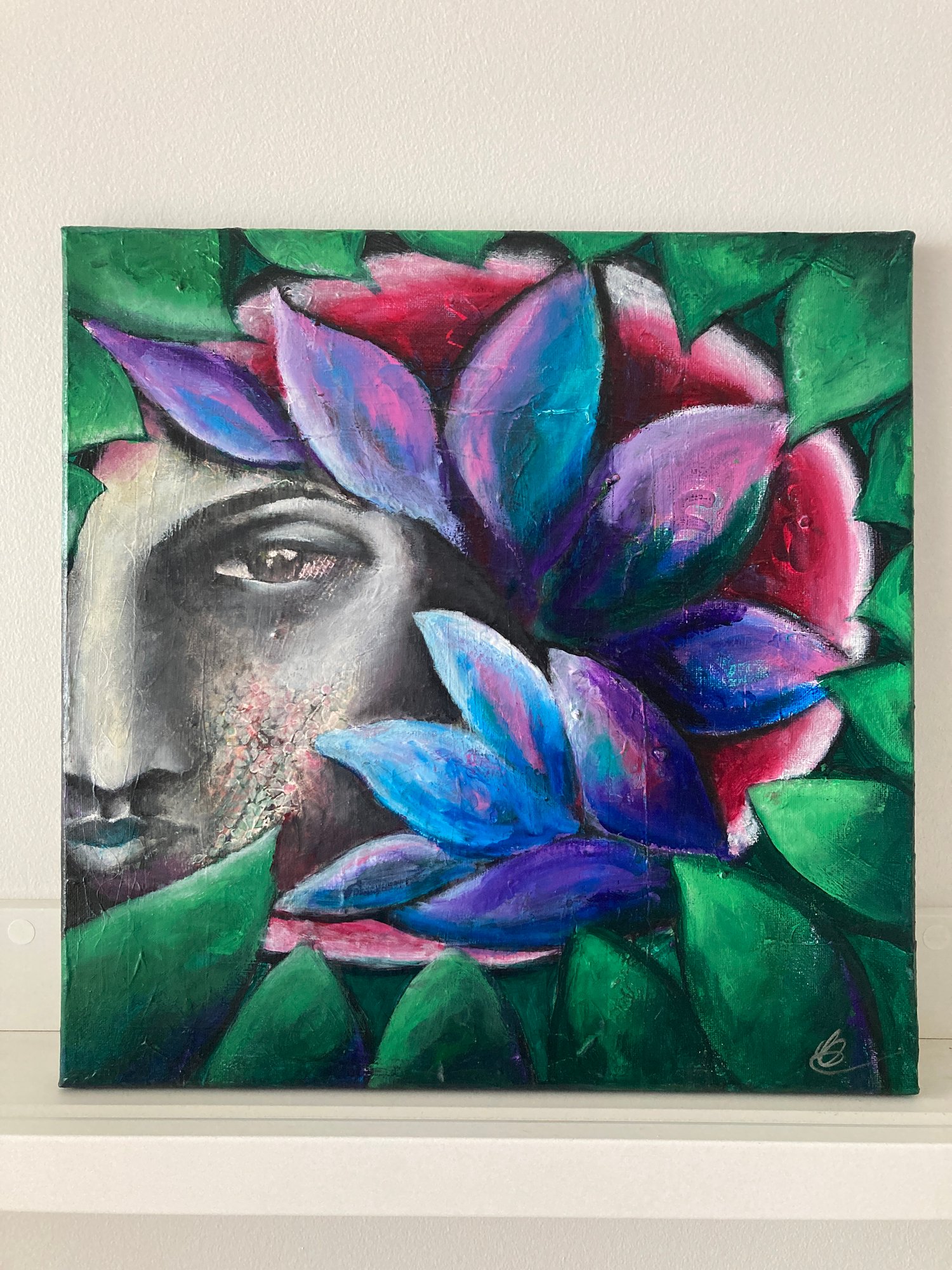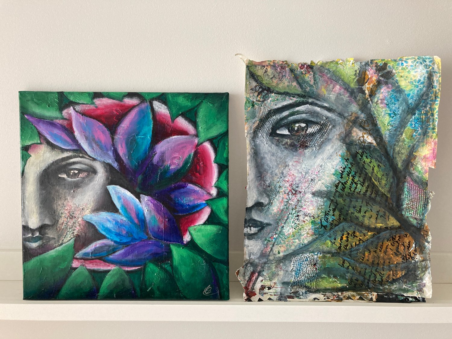 The left item is of the mounted print. It is based on the mixed media original, on the right hand side. The original is not for sale.