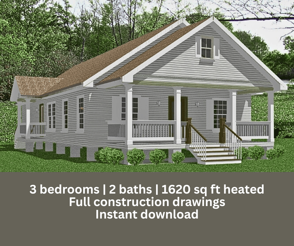 Cheryl Cottage House Plan: 3 Bedroom, 2 Bath, 1620 sq ft (PDF Download Construction Blueprints)