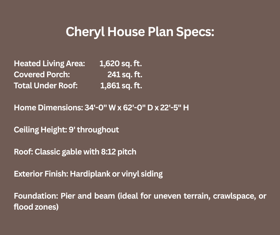 The Cheryl Plan is a thoughtfully designed 3-bedroom, 2-bathroom home perfect for a growing family, retirement build, or investment property. With a clean and functional layout and a classic gable roof, this plan brings affordability, comfort, efficiency, and style together in one smart package.
