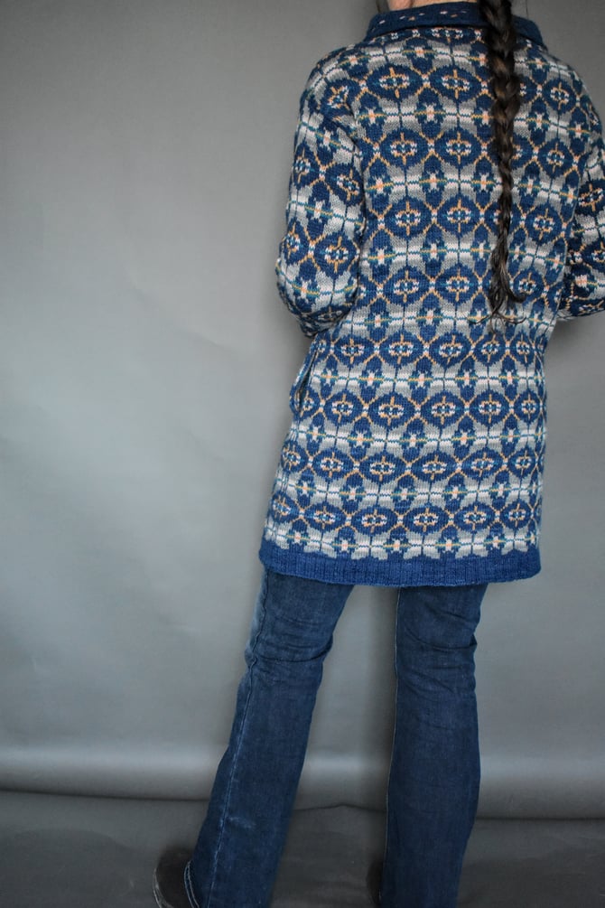 Aquaforte is a coat of strength; double-breasted, warm and sturdy with flair. The coat is a modified drop-shoulder construction, knit bottom up and in the round with steeks at the front opening and armholes. A touch of floral eyelets overlaying some stripes finish the collar and cuffs.