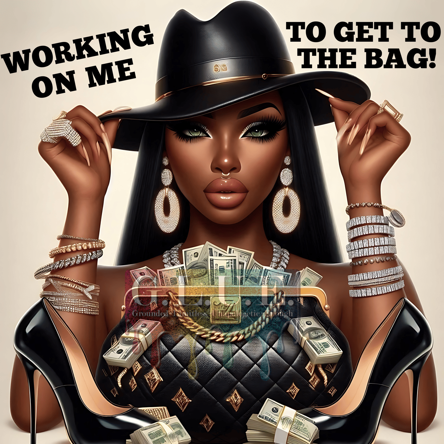 Working on Me to Get to the Bag -Kera PNG | Luxe Black Woman Empowerment Art | Motivational Self-Work Quote