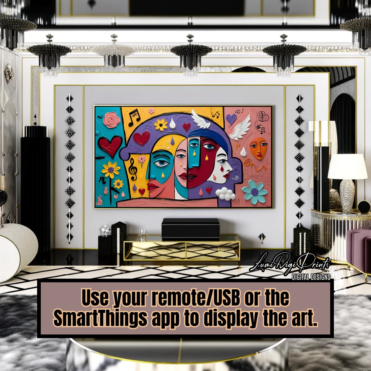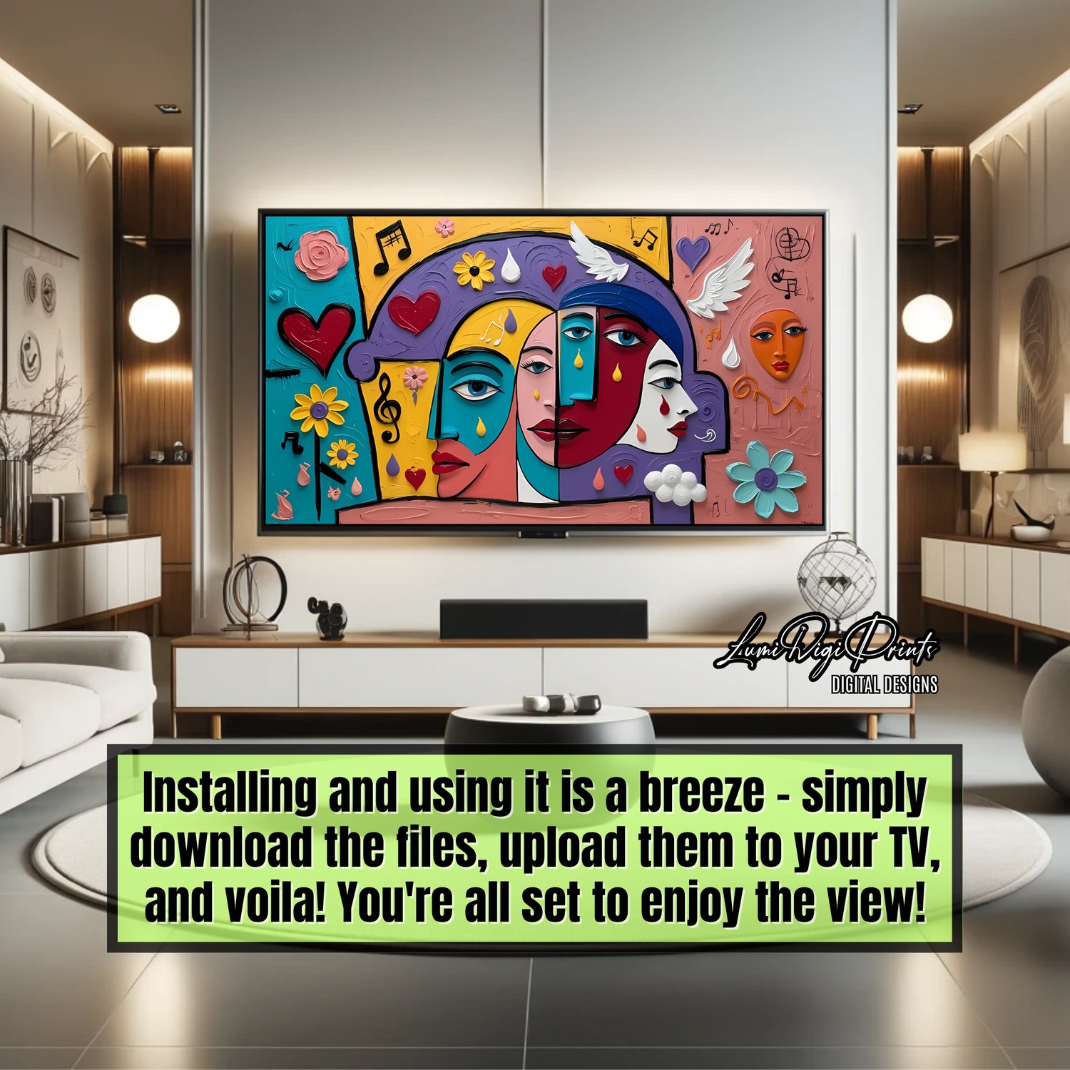 Bring color, rhythm, and emotional energy to your space with “Melody of Faces” — a striking abstract digital art piece designed for Samsung Frame TVs and smart screens.