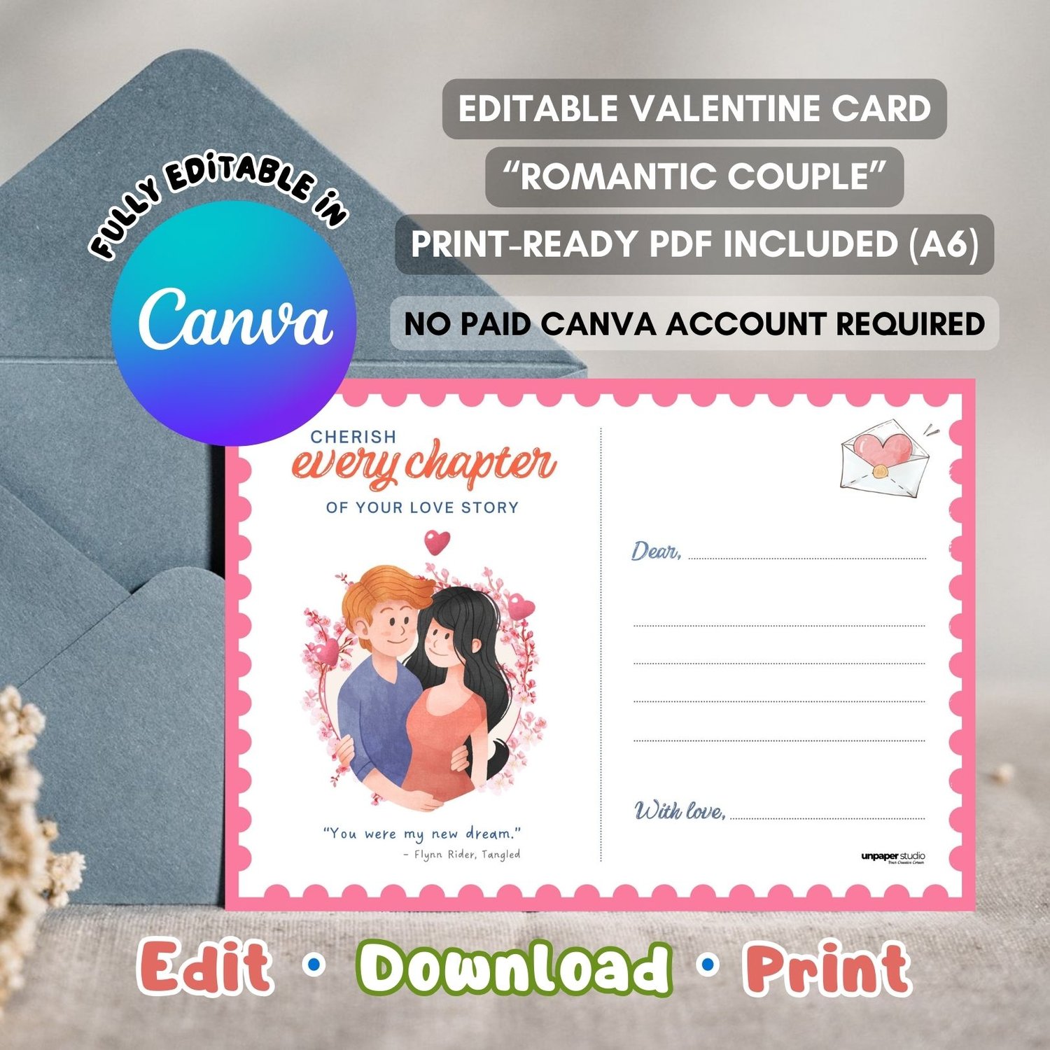 Celebrate love and togetherness with this Romantic Couple Valentine Card. Featuring a sweet couple illustration in a soft, dreamy style, this A6 editable Valentine card is perfect for partners, anniversaries, engagements, or heartfelt Valentine messages.