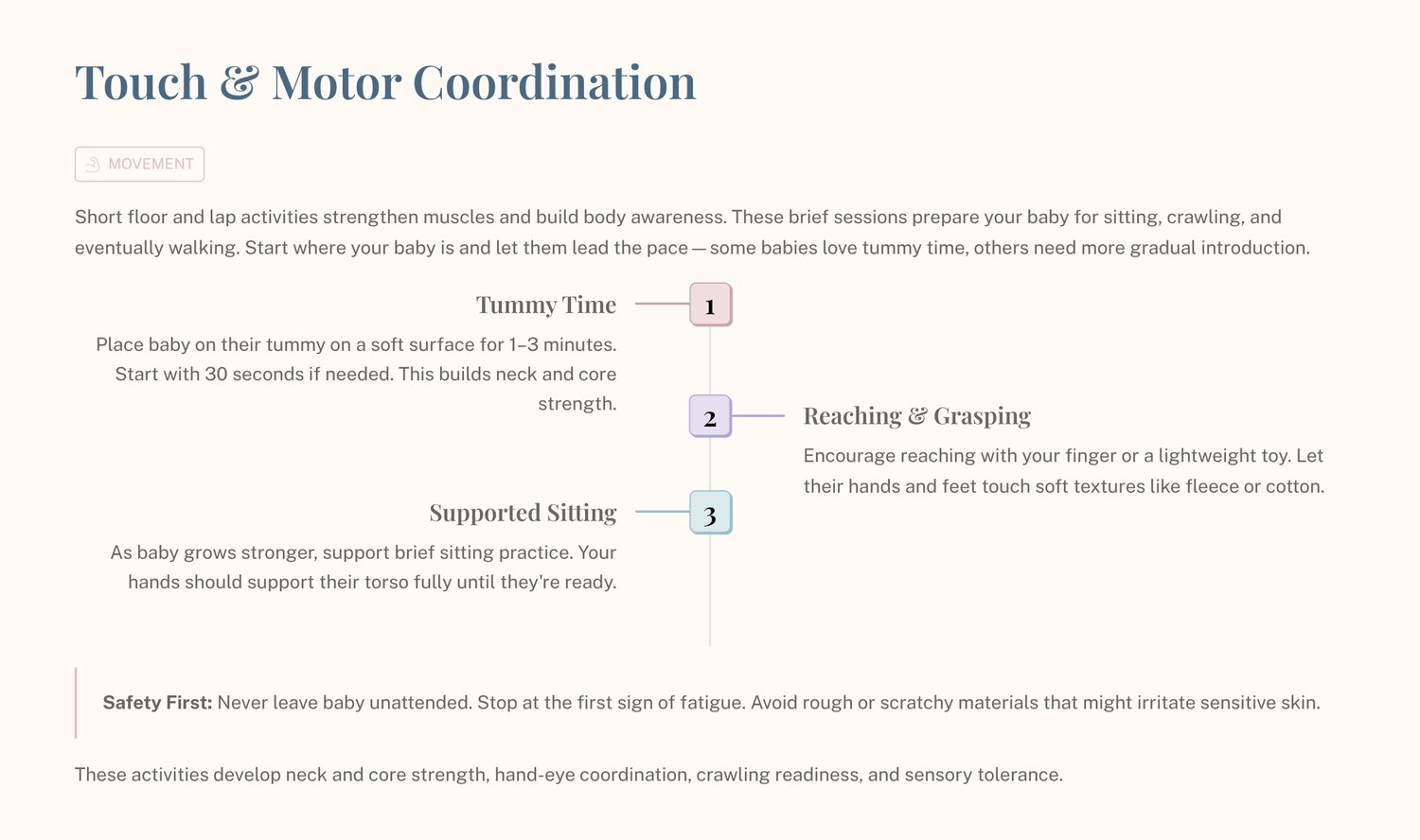 The Early Blooming System creates a peaceful rhythm where learning feels like love in motion. A few minutes at a time, repeated throughout the day, becomes a powerful foundation for focus, emotional awareness, sensory development, and early motor strength. Parents are reminded that progress happens in tiny steps — a glance that lasts a second longer, a reaching hand, a quiet laugh, a calm bedtime.
