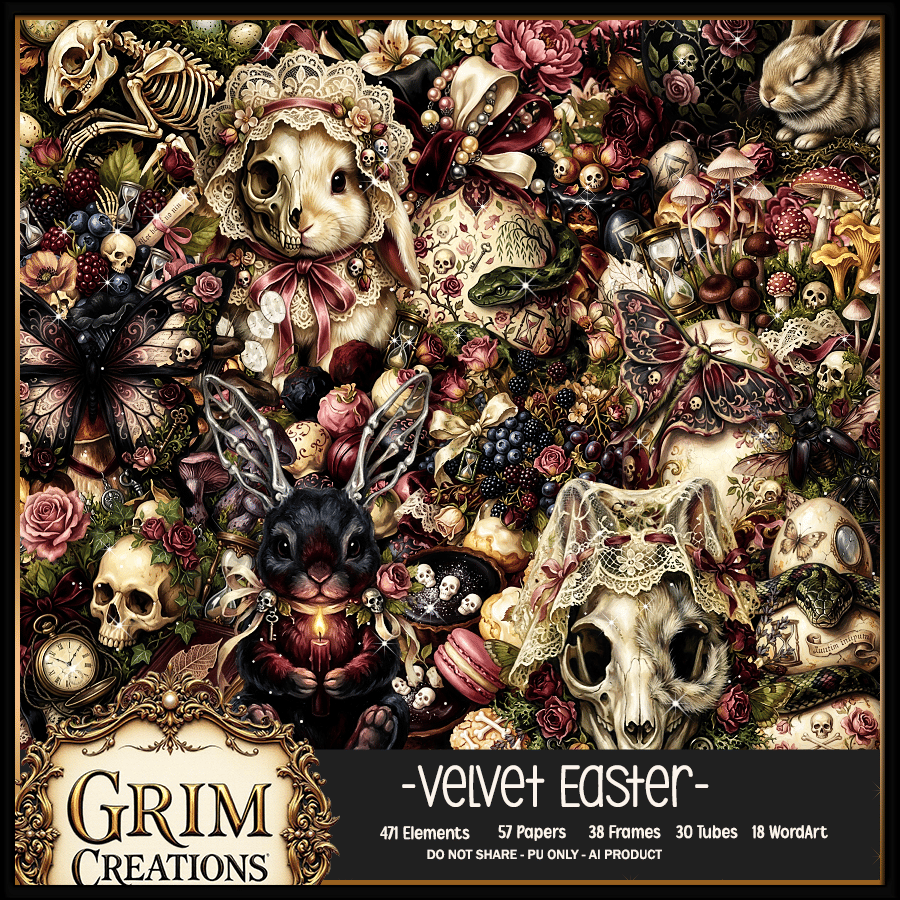 Think velvet ribbons, dark florals, ornate eggs, shadowy bunnies, and delicate details wrapped in a soft gothic glow. Perfect for creating unique Easter designs with a dramatic, romantic twist.