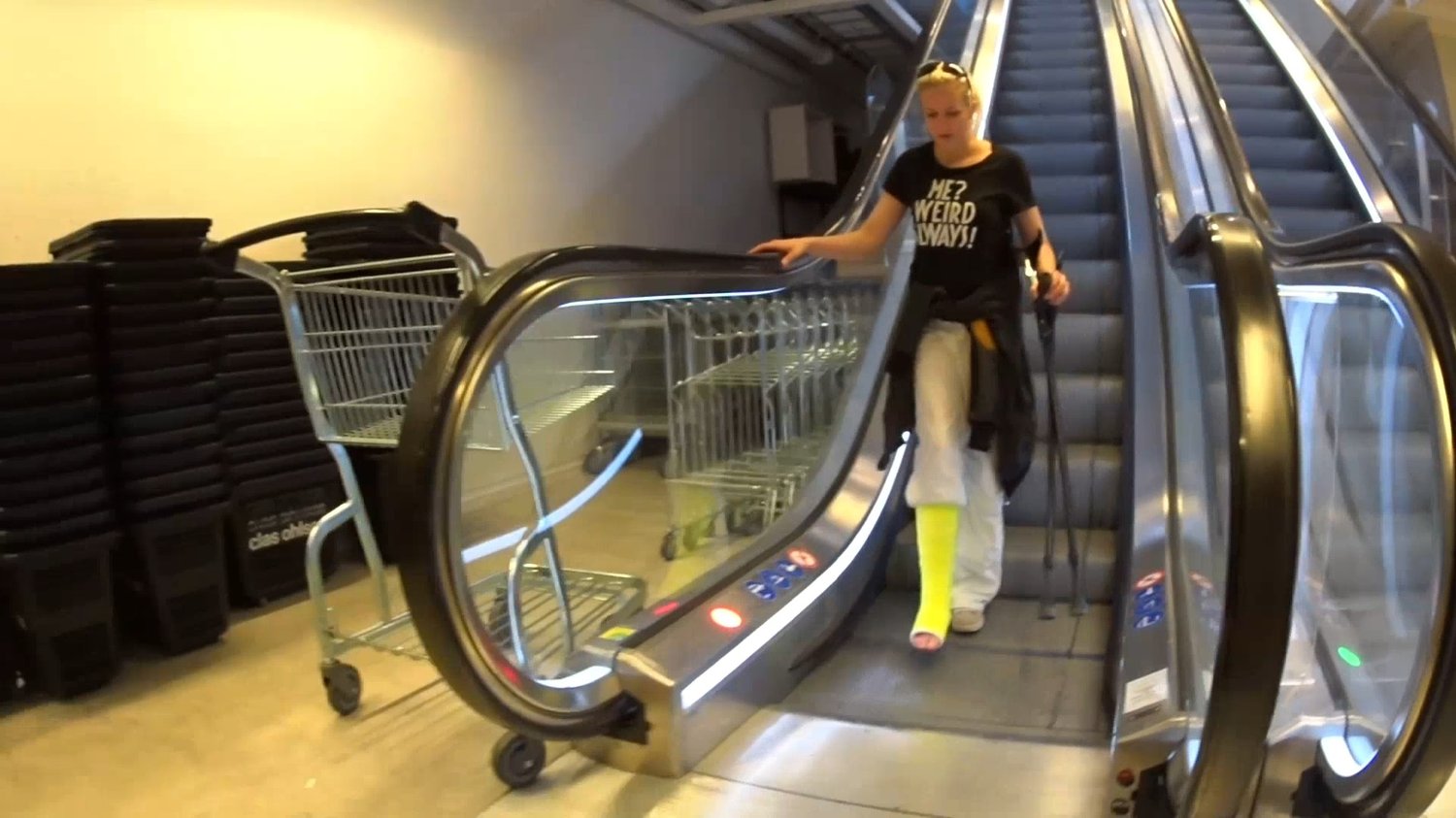 Alva takes the escalator down to the store and she has now rolled up one leg of her pants so we can see her yellow cast better.In the store she find a Hopscotch she trys even if it´s in the middle of the store.After she leaves the store she sits down on a bench so we can get some semi closeup of her cast before she start crutching back out on the street.