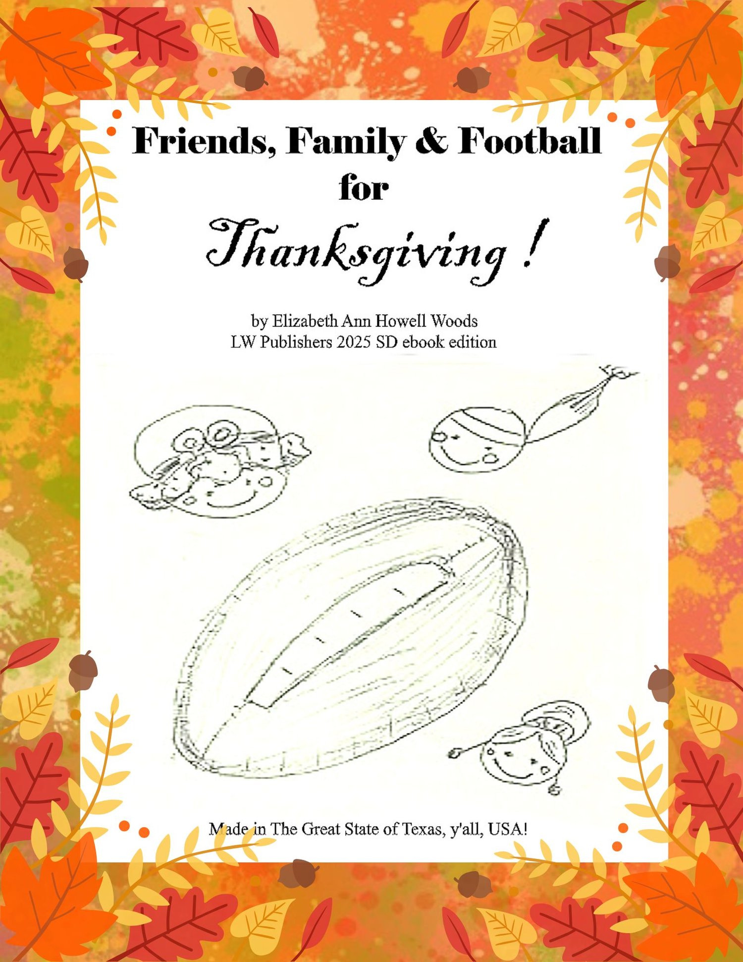 Welcome to Friends Family and Football for Thanksgiving's coloring book for next year! Temporarily lost, but now re-discovered! You'll love this one! Written and Illustrated by author Elizabeth Ann Howell Woods, published by LW Publishers in the Great State of Texas, USA. 2025 SD eBook edition