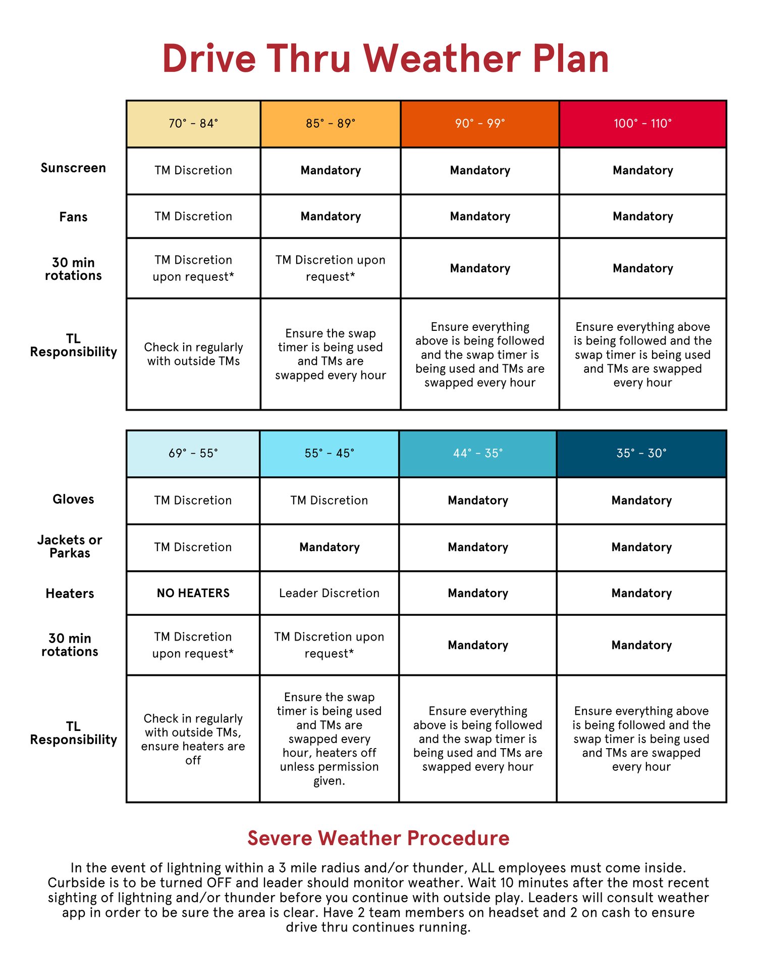 This weather plan is essential to have in-restaurant for clarity for both your leaders and team members. This is the general breakdown which follows chain-wide standards as well as most state regulations.