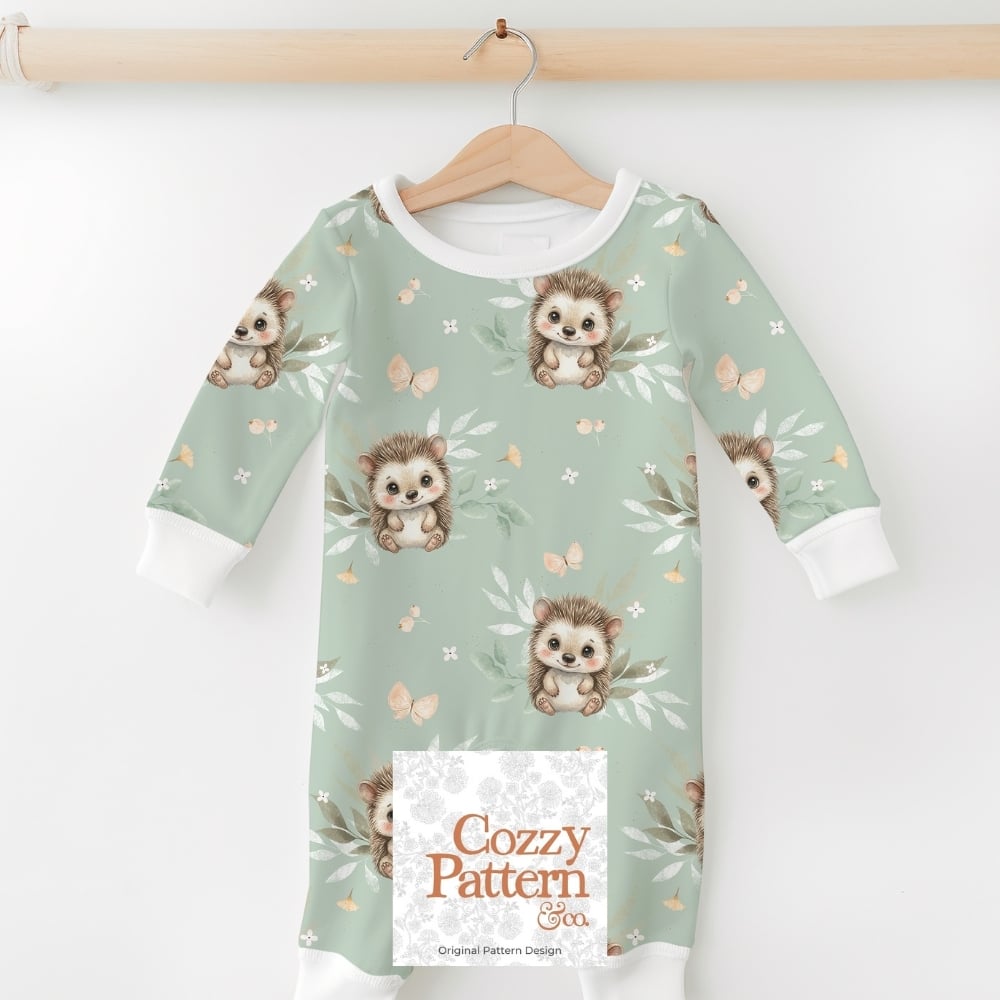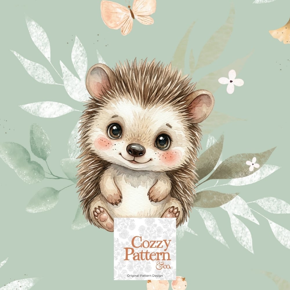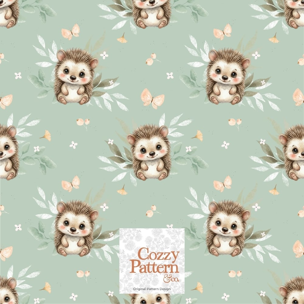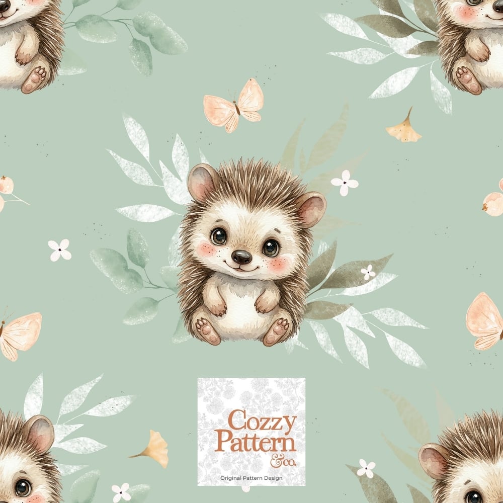 Create soft and heartwarming baby and nursery projects with this seamless hedgehog pattern featuring an adorable little hedgehog surrounded by delicate leaves, butterflies, and subtle forest elements.