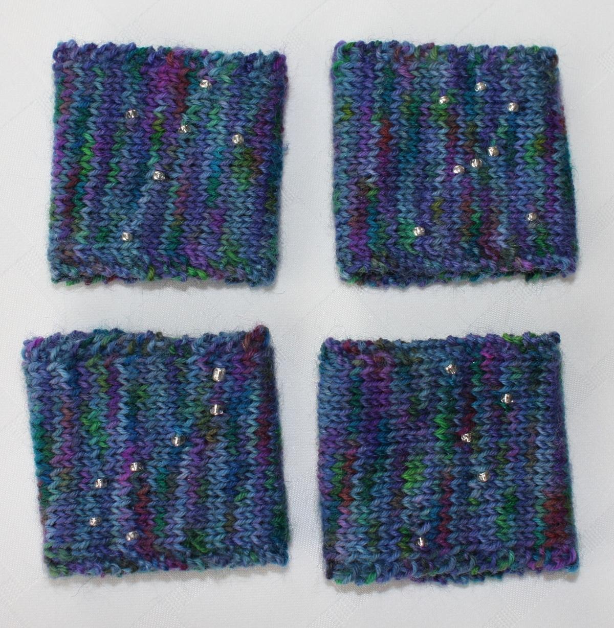 Every summer, knitters the world over plan to get a jump on their winter gift knitting. But, for many of us, it’s so hot in the summer! Who wants to work on some large woolly shawl all summer long? This is probably is why so many of us make cotton dishcloths as gifts… So… why stick to the same-old-same-old when there are so many techniques to try and so many little home projects to experiment with – like… napkin rings!! These rings use sock yarn (perhaps the end of a skein already turned into socks?) and a small number of beads each to depict four popular and easy-to-identify constellations in the night sky. This is a good introduction to beading and chart reading, as the background is a straightforward stockinette stitch with garter edging, and the buttonhole is made with a double yarnover.