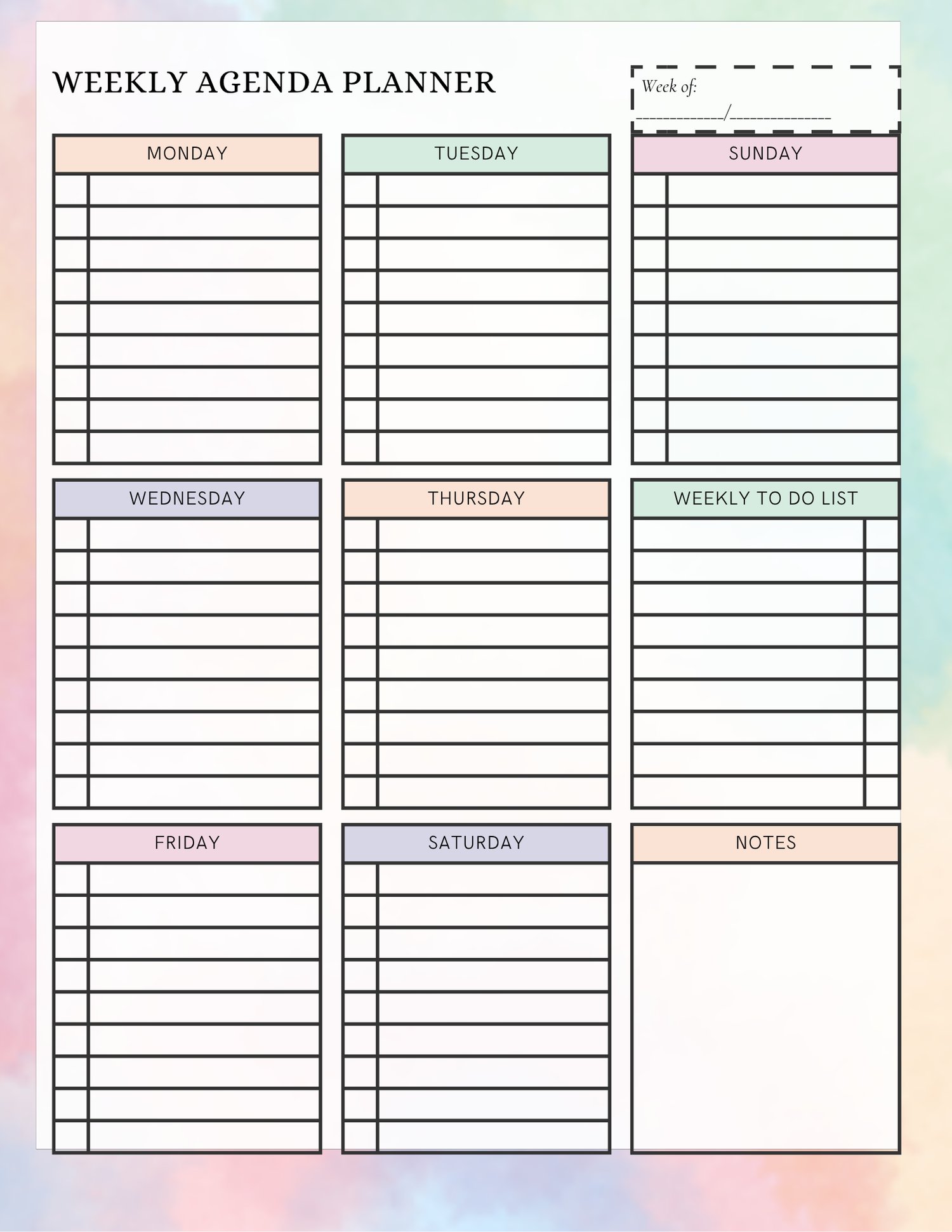Stay organized and productive all week with this beautifully designed Weekly Agenda Planner! Featuring soft pastel tones and clean sections for each day of the week, this printable PDF is perfect for tracking your daily tasks, appointments, study sessions, or work shifts. It also includes space for weekly to-dos and personal notes.