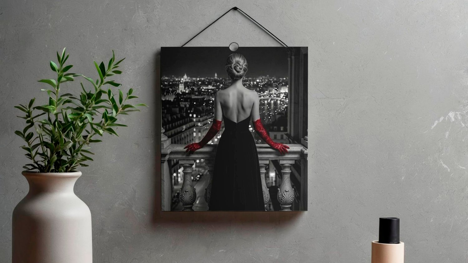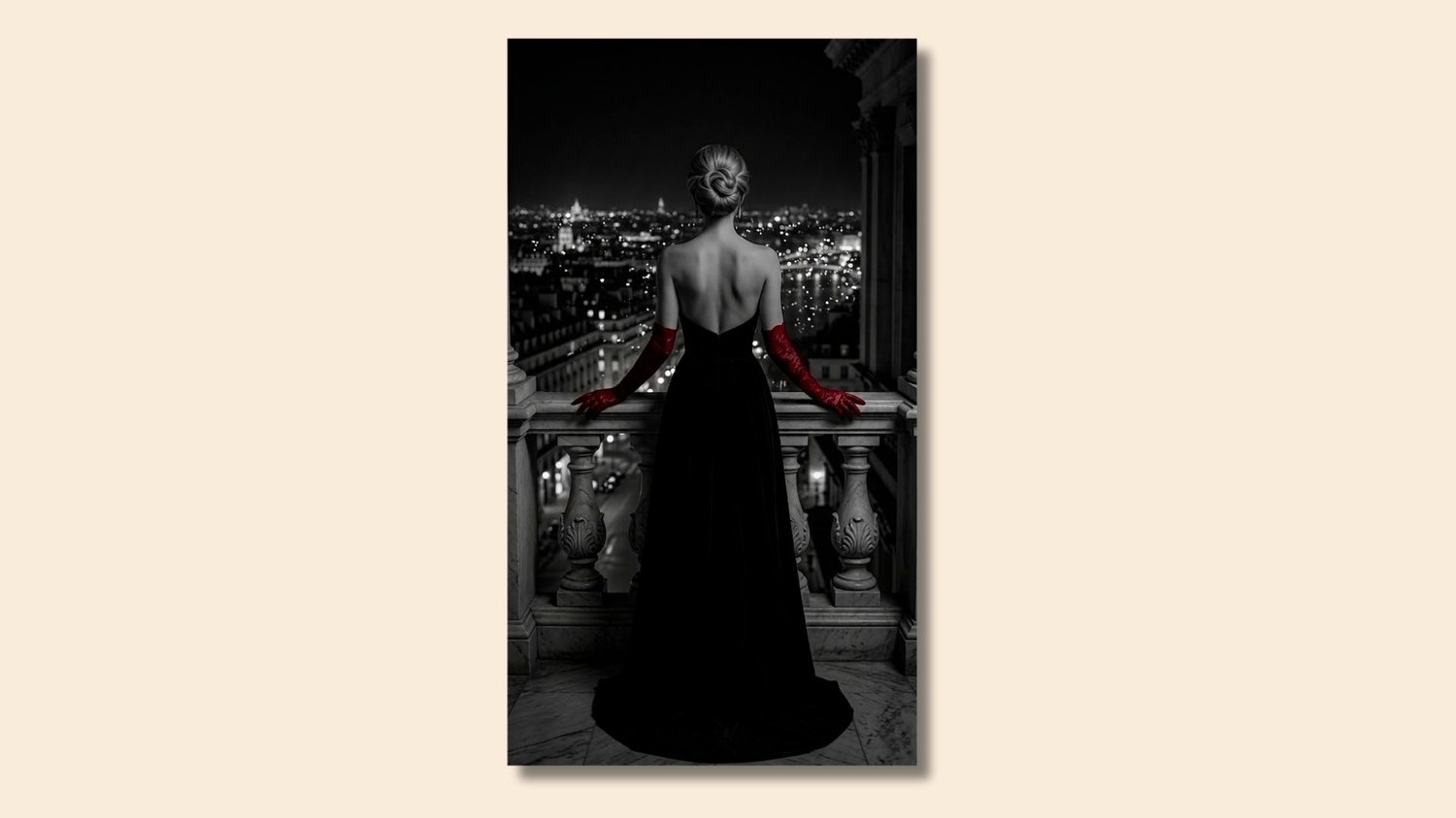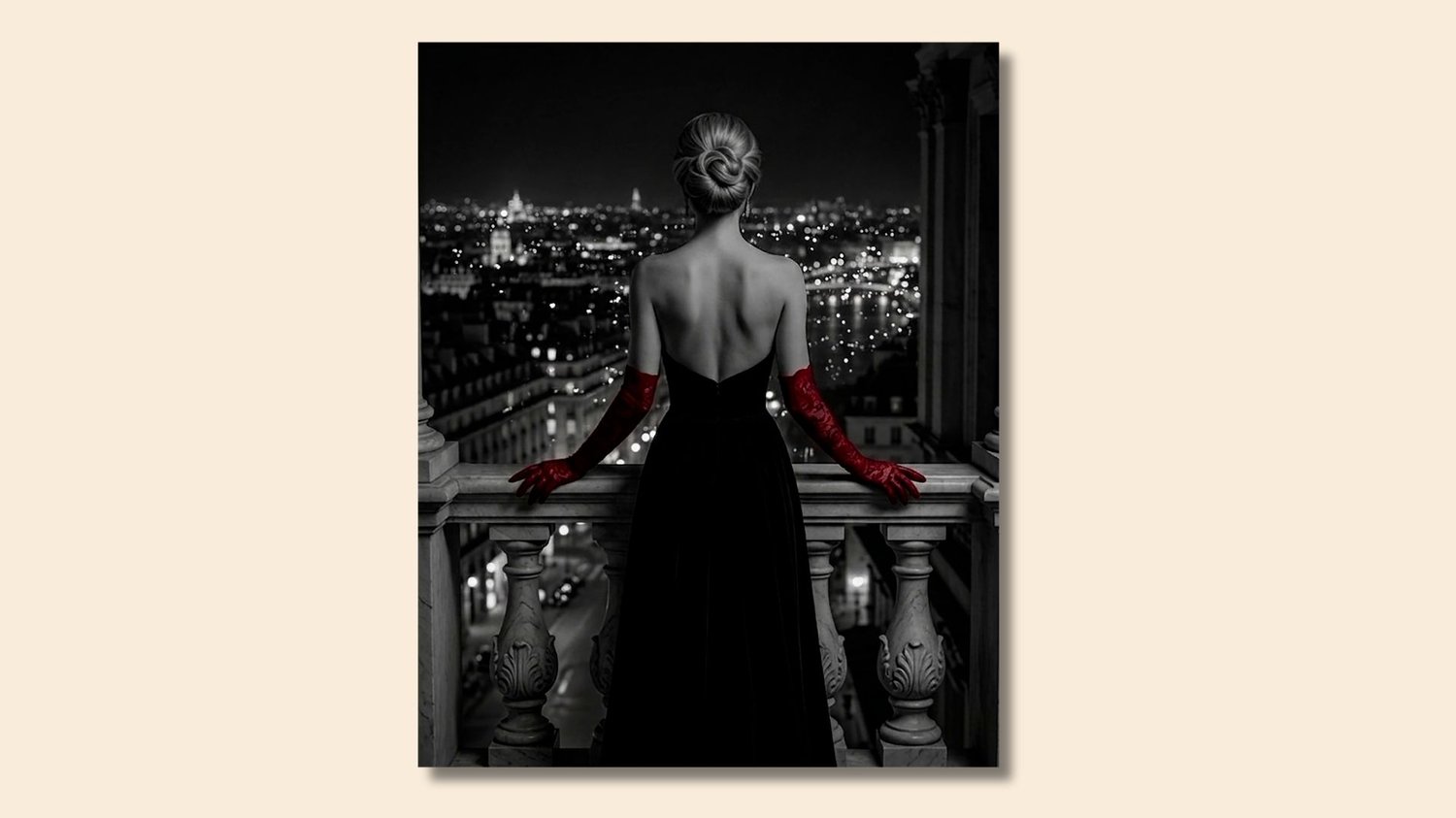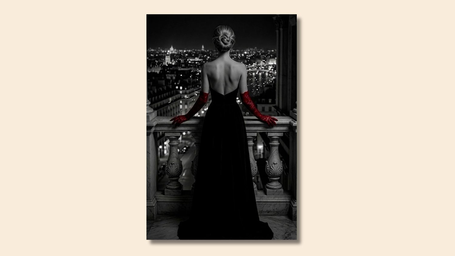 Breathtaking Noir wall art of a woman in red opera gloves overlooking a night city skyline. This Parisian-style black and white print is the ultimate fashion statement for modern living rooms or chic office spaces. Combines urban landscape with high-fashion elegance.