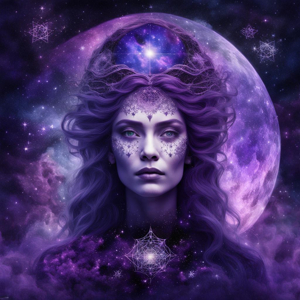 "Step into a world of mysticism and wonder with this ultra-high-quality digital artwork of a majestic cosmic witch. This piece beautifully combines intricate details and vibrant colors to create a stunning double exposure effect. The witch, adorned with stars and galaxies, is set against a mesmerizing purple fantasy sky. With its exceptional 16 resolution quality, this artwork offers unparalleled clarity and depth, making it a standout addition to any collection. Perfect for lovers of fantasy and cosmic art, this piece adds a touch of magical elegance to your space."