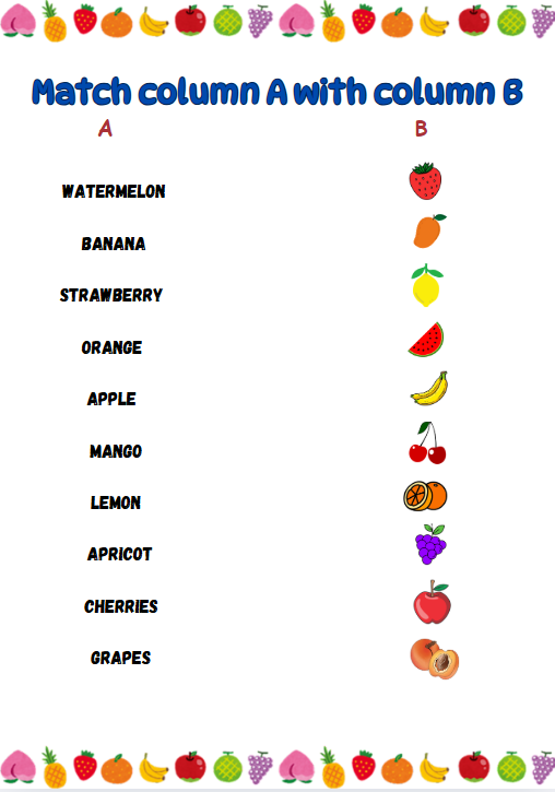 - Cute fruit illustrations like apples, bananas, pears, grapes, oranges, and more