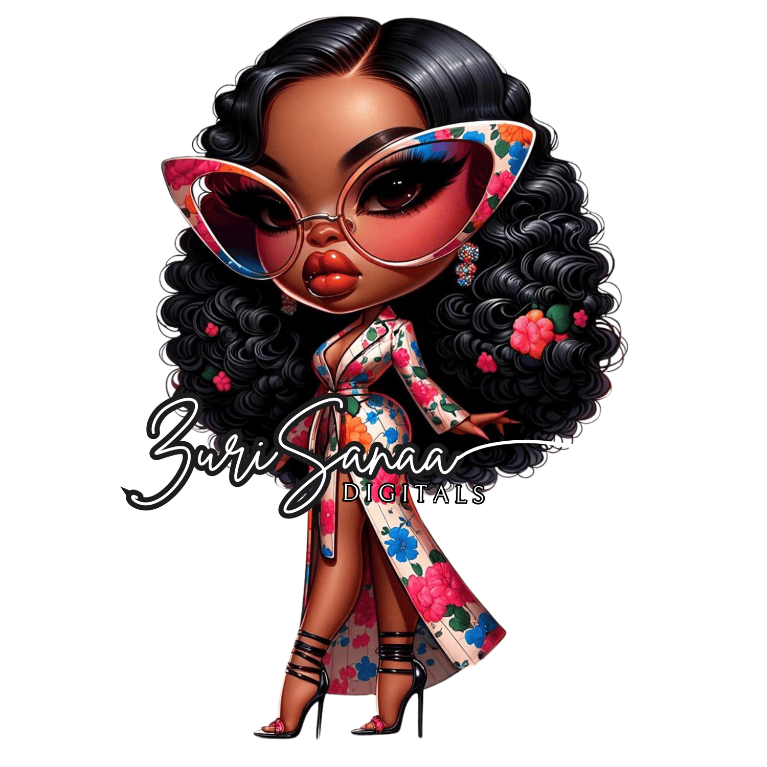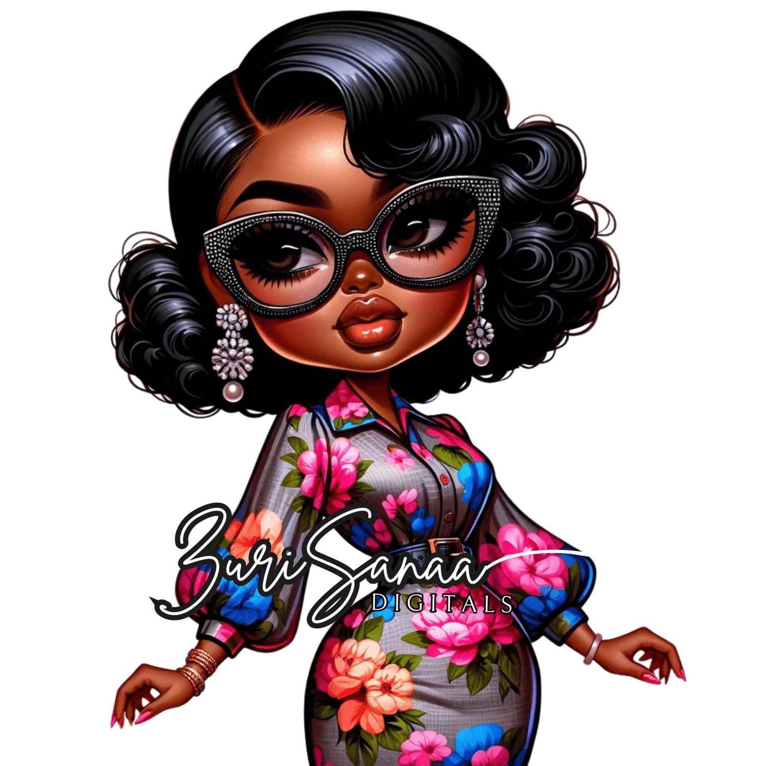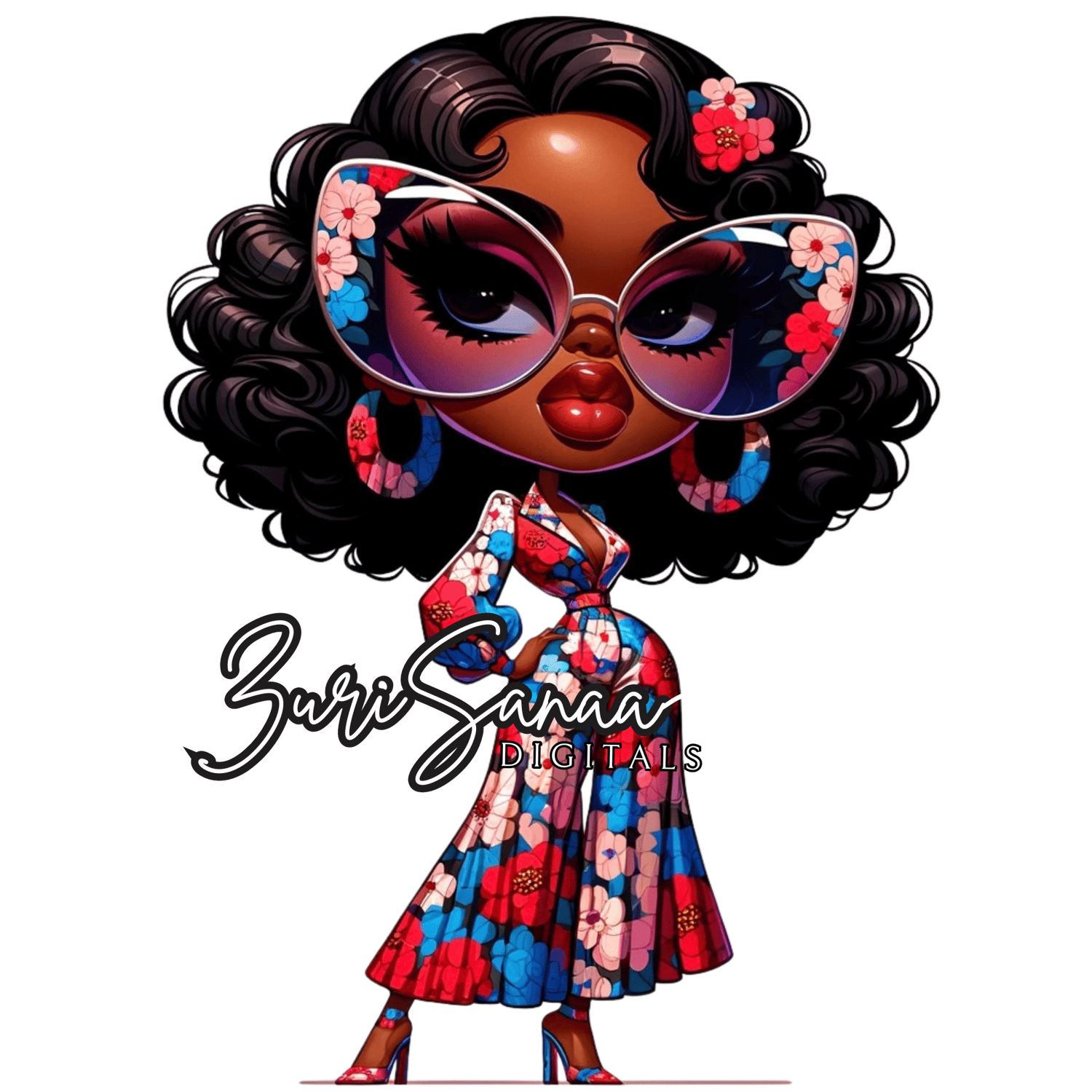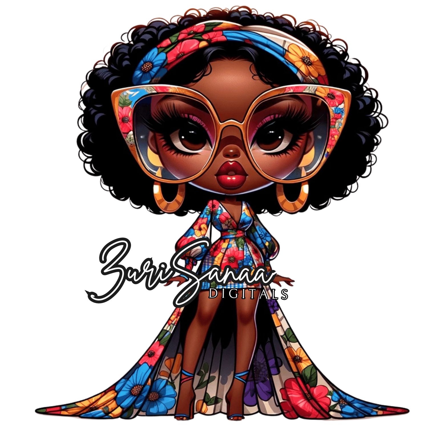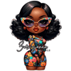 Dive into a world of playful charm and fashion with "Retro Bloom," an exclusive collection of 10 PNG images that bring the vibrant spirit of retro style into the modern era. Each image features a beautifully illustrated Black woman in a retro floral outfit, depicted in the adorable and expressive chibi style. Her exaggerated features, including very large, abstract glasses, capture her playful and fashionable character, embodying the essence of retro charm and contemporary flair.