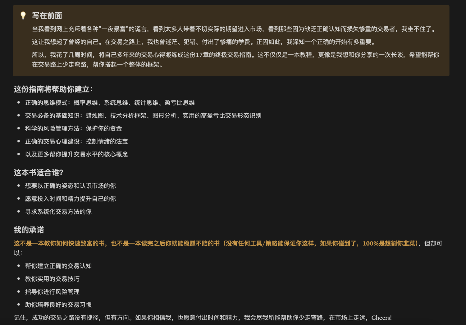 所以,我花了几周时间,将自己多年来的交易心得凝练成这份26章的终极交易指南。这不仅仅是一本教程,更像是我想和你分享的一次长谈,希望能帮你在交易路上少走弯路,帮你搭起一个整体的框架。