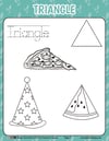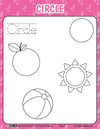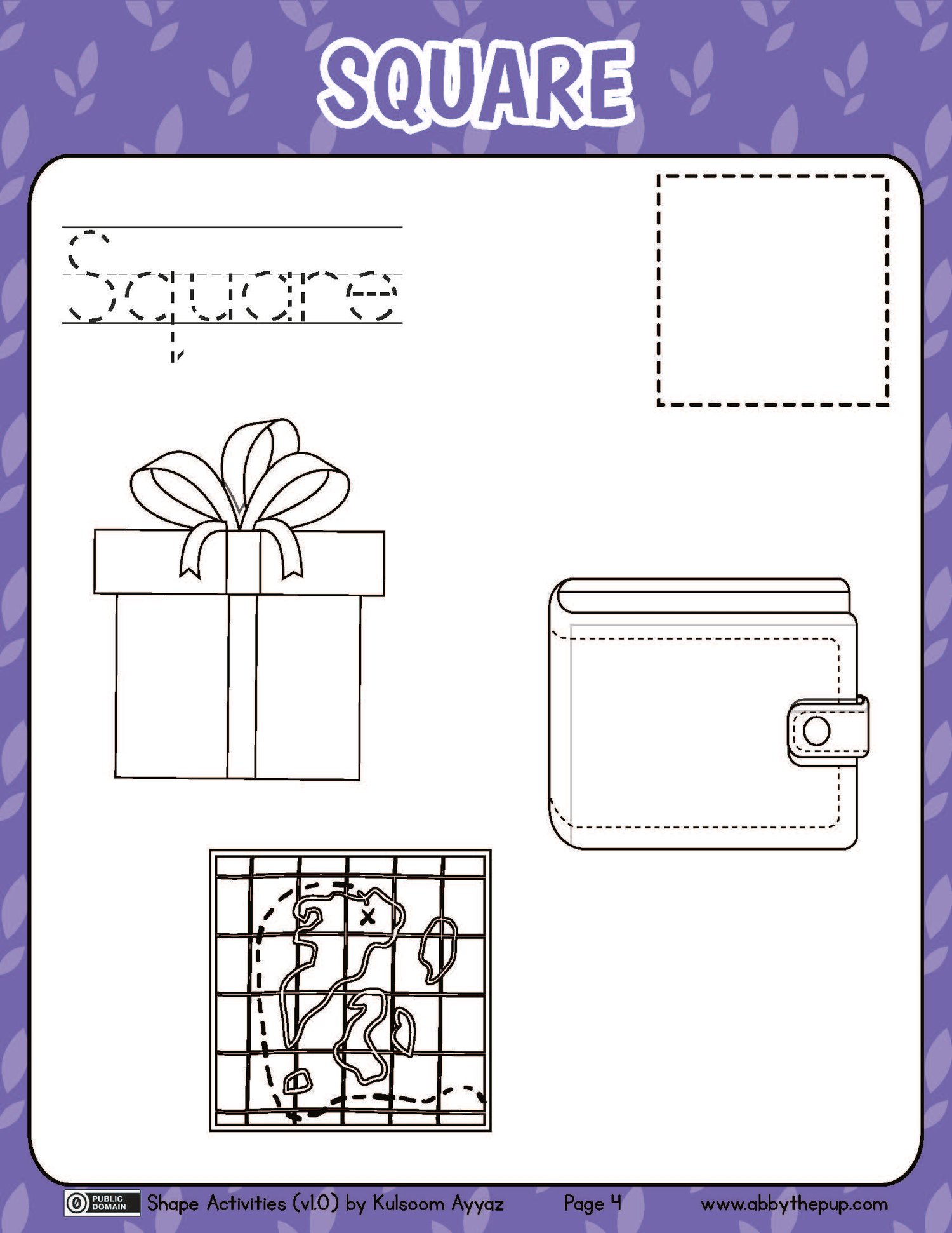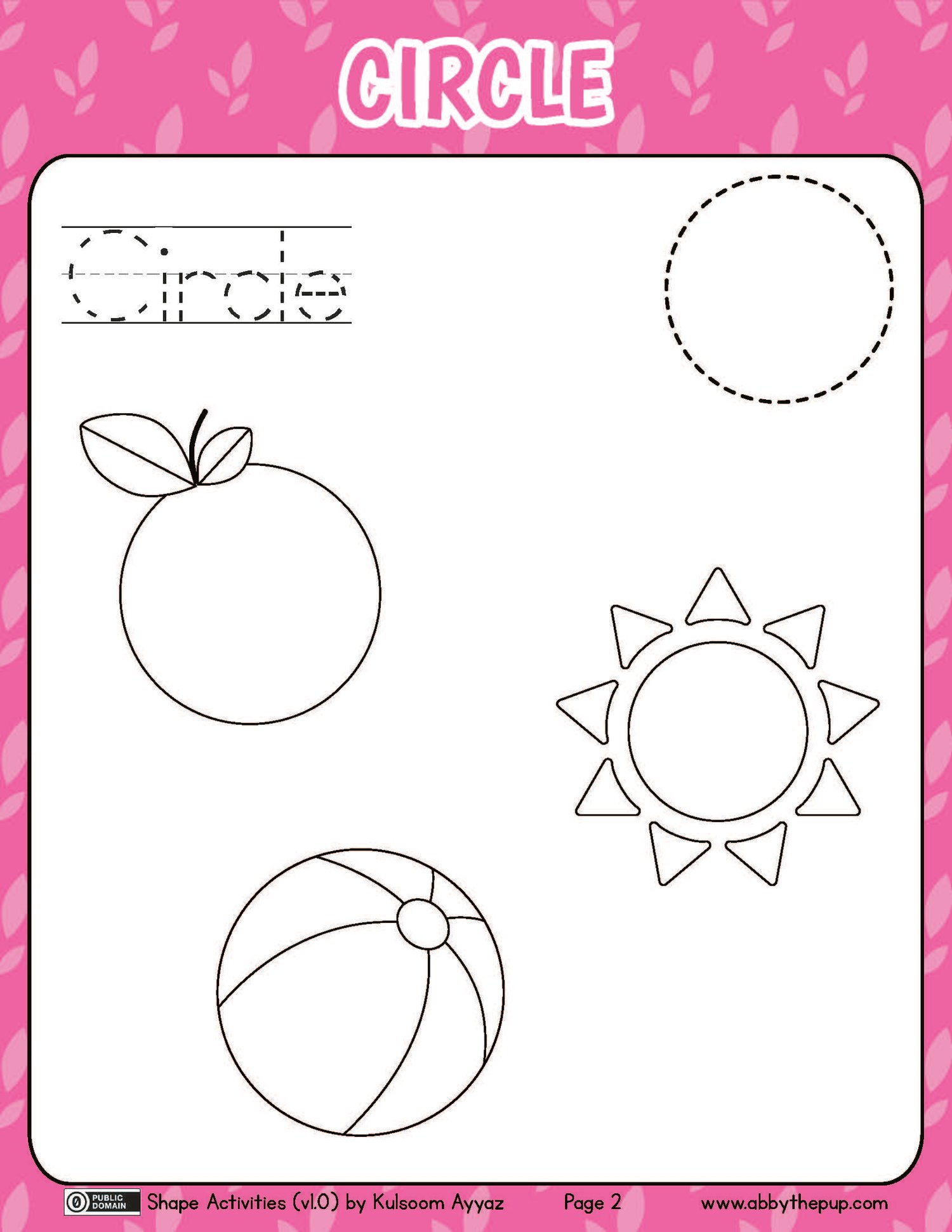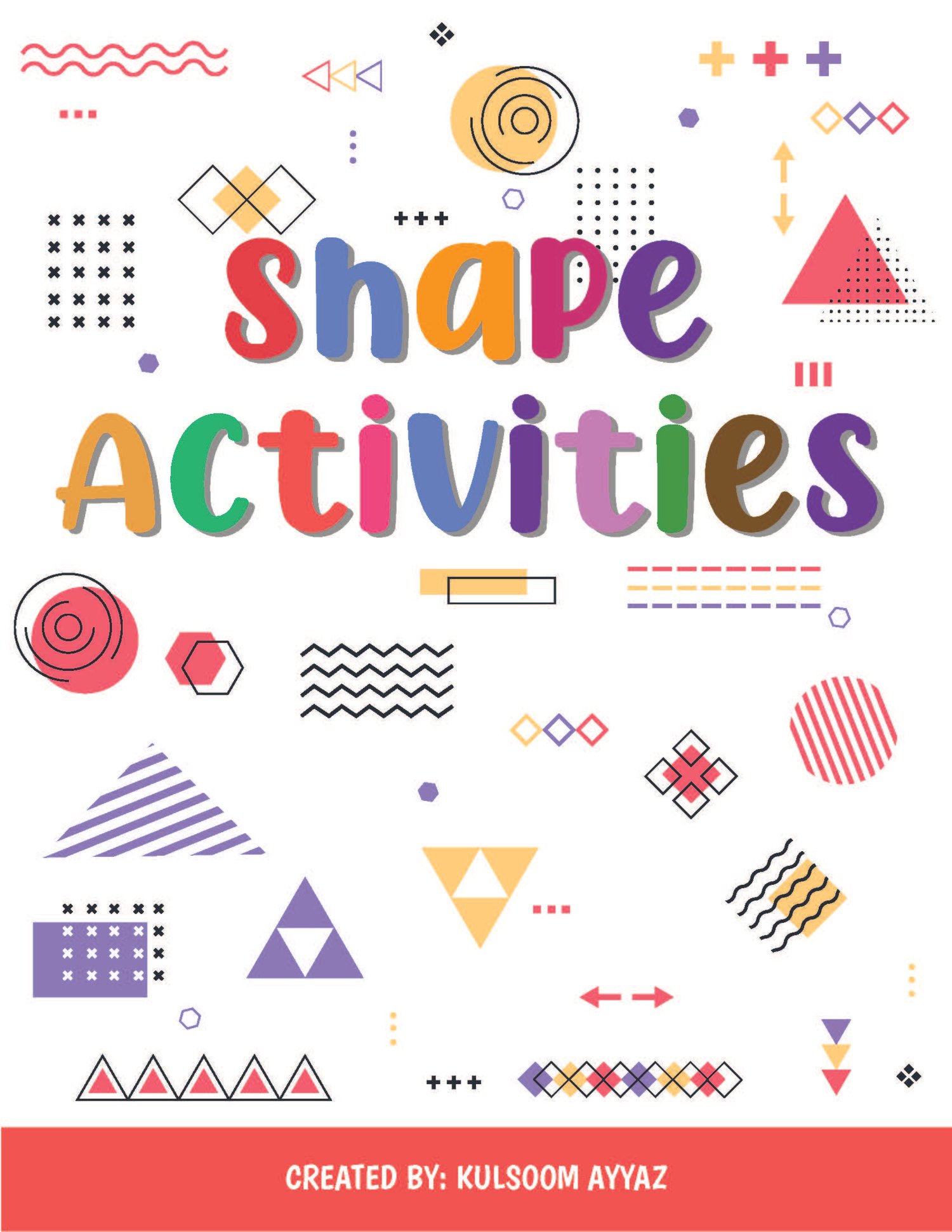 The document is a workbook created by Kulsoom Ayyaz for teaching children about basic shapes. It includes pages with exercises to circle, match, or cut out examples of circles, triangles, squares, rectangles, ovals, diamonds, hexagons, stars and hearts. The workbook provides activities to help children learn shape names and identify shapes by their visual characteristics.