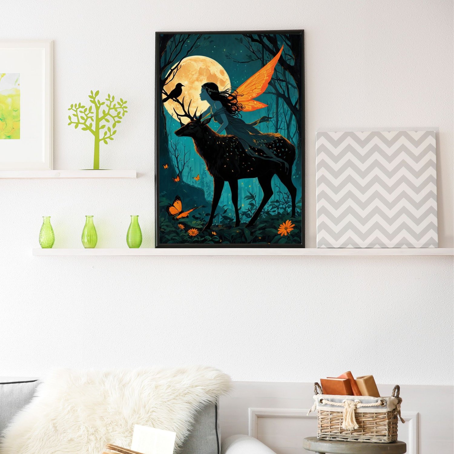 This mesmerizing collection of wall art captures the ethereal beauty of an enchanted forest where fantasy and nature intertwine. Each piece radiates a mystical energy, featuring fairies, majestic deer, and surreal moonlit backdrops.