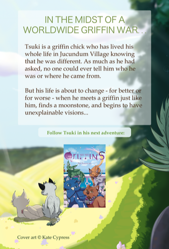 Summary: Tsuki is a griffin chick who has lived his whole life in Jucundum Village knowing that he was different. As much as he had asked, no one could ever tell him who he was or where he came from. But his life is about to change -- for better or worse -- when he meets a griffin just like him, finds a moonstone, and begins to have unexplainable visions.