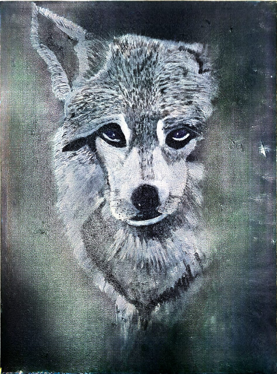 "Gentle Solitude" is an evocative 100 x 80 cm canvas that softly captures the tender gaze of a lone wolf, a creature often symbolizing independence and strength, yet here it reflects an unexpected gentleness. This artwork began as a tribute to the solitude of a wolf but transformed into a poignant homage to the artist's beloved dog, whose memory lingers like a delicate whisper.