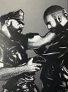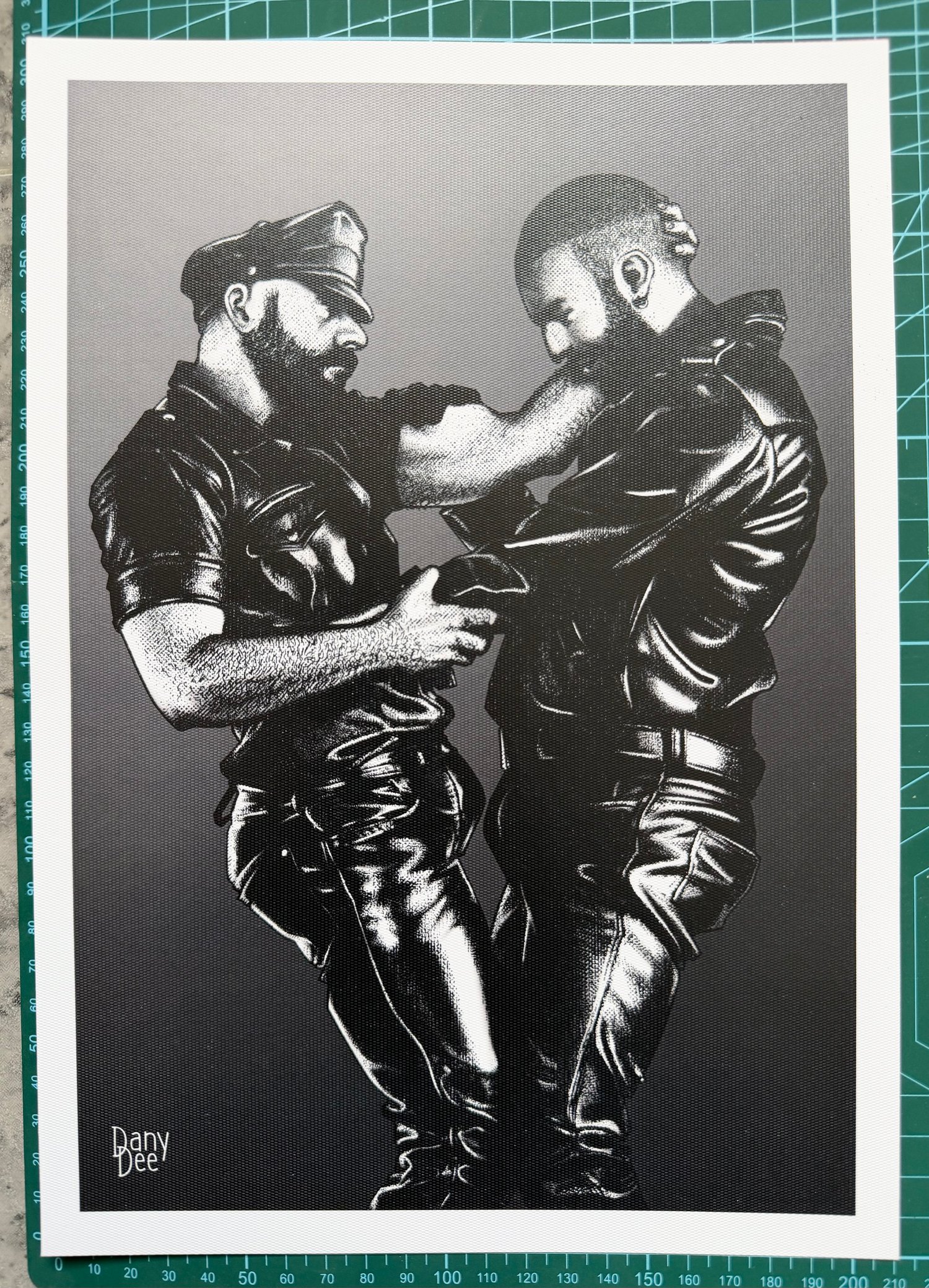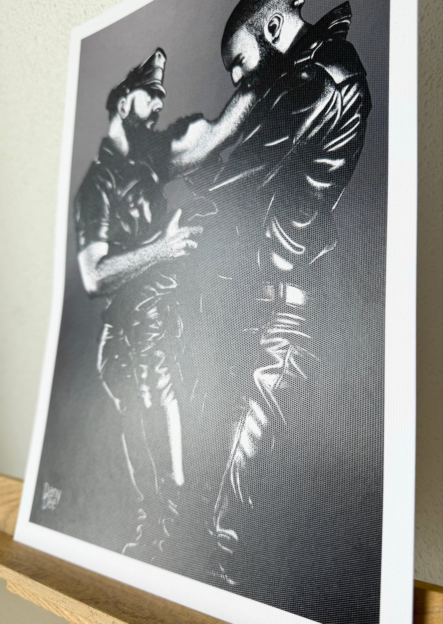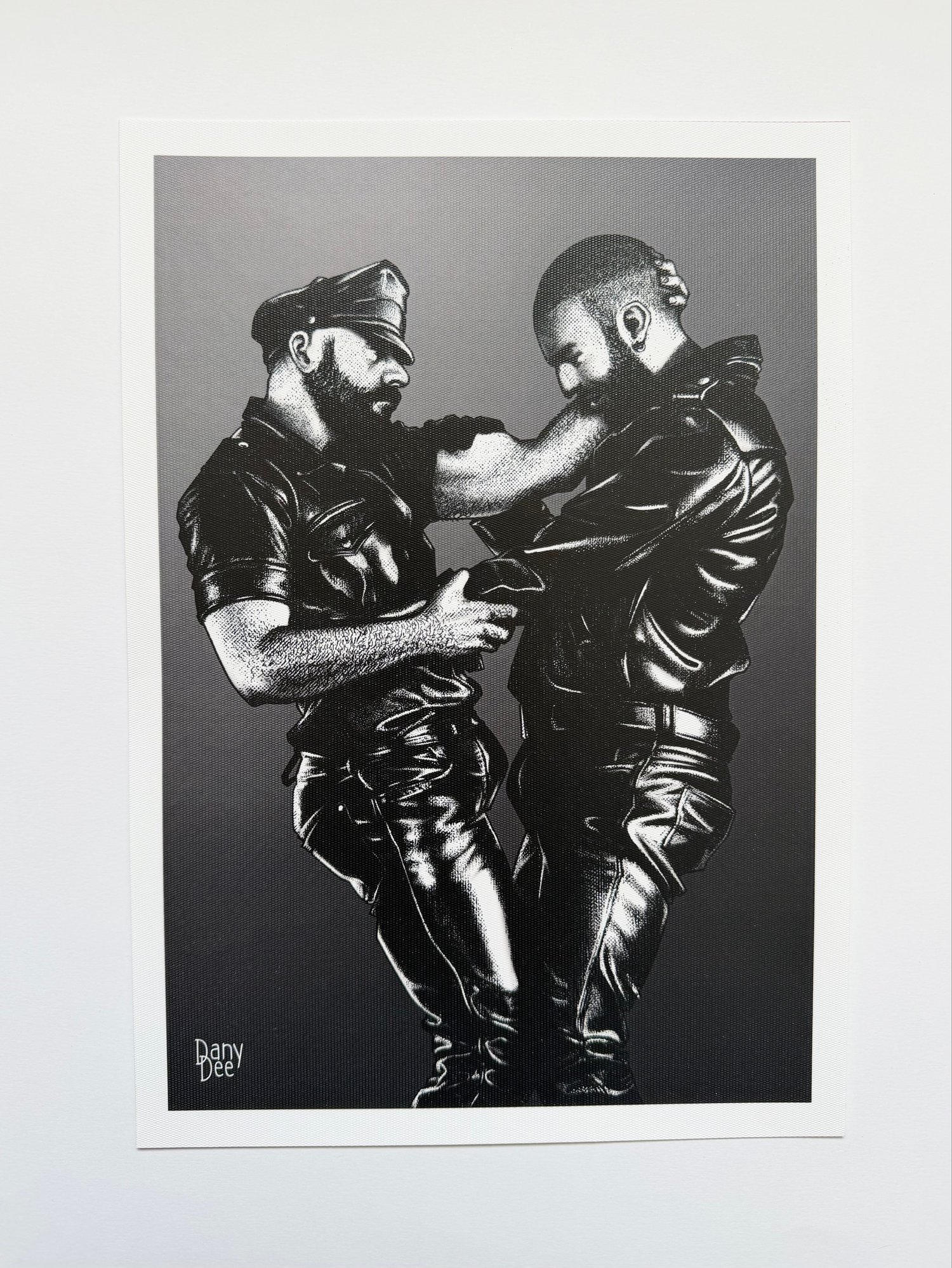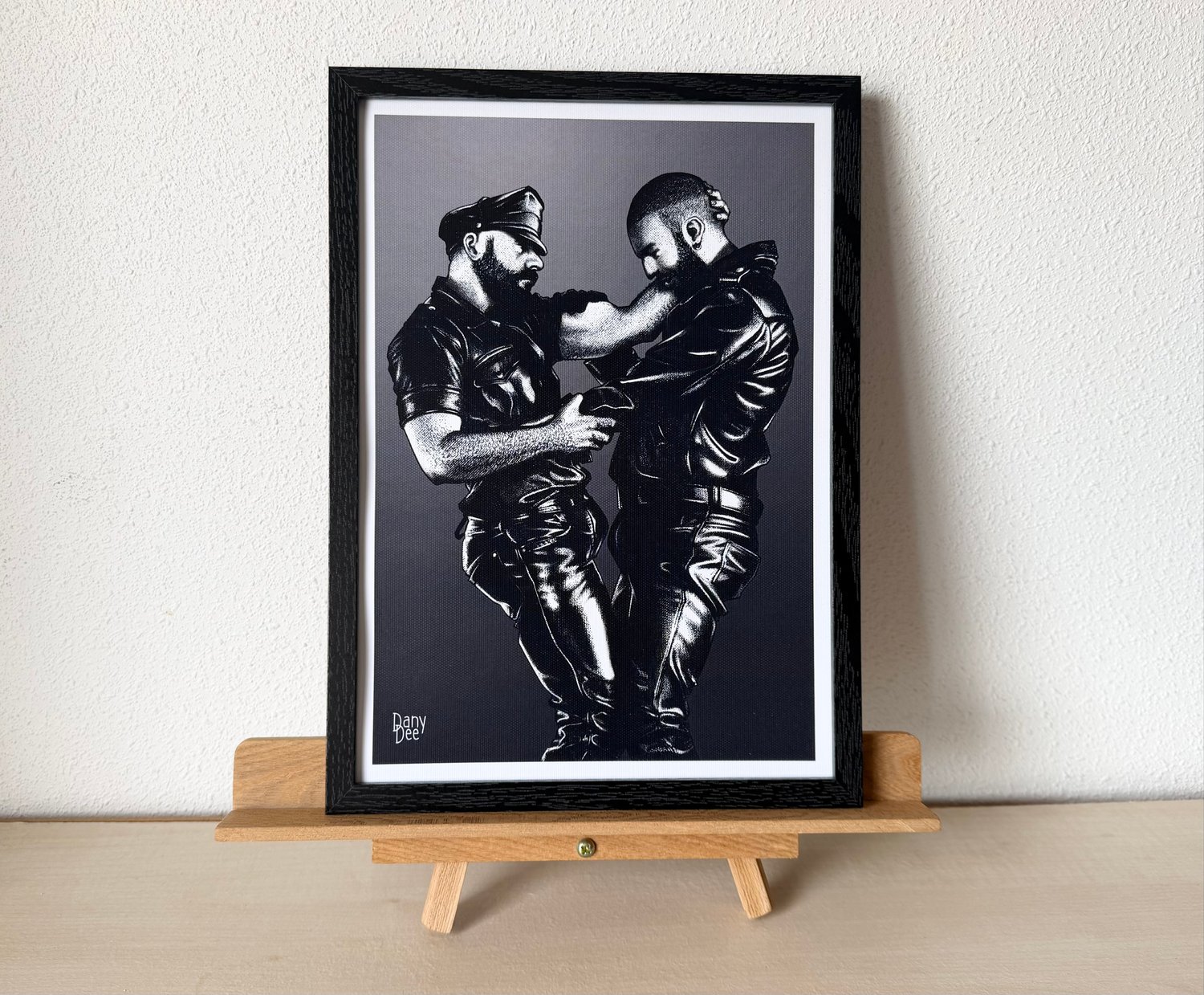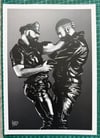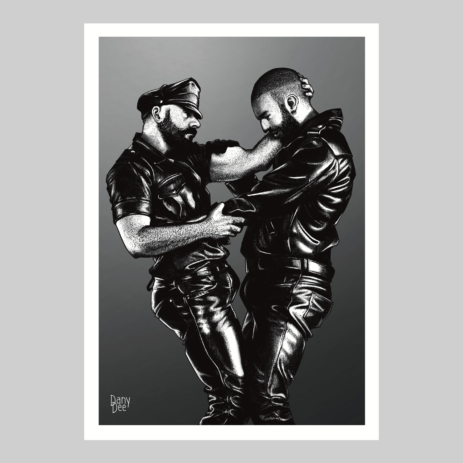 "Together" is a hand-drawn, monochromatic A4 art print celebrating gay leather culture and queer love — an intimate homoerotic illustration of two bearded men in full black leather, facing each other in a charged and tender moment, inspired by the iconic works of Tom of Finland.