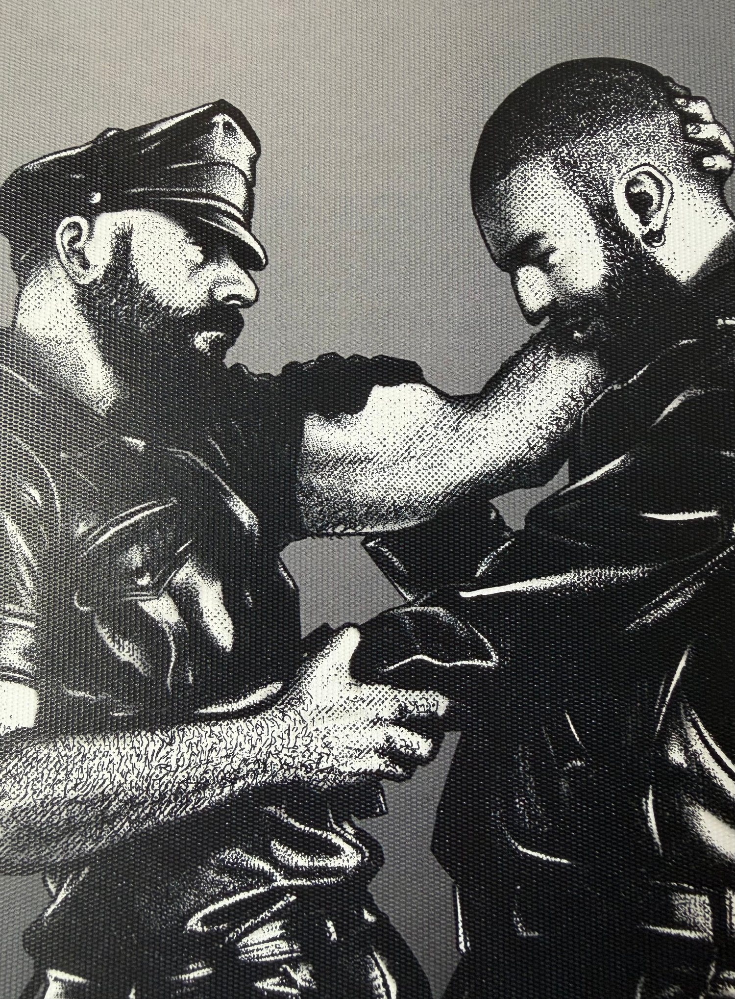 A bearded man in a leather cap and a bald man in a leather jacket — bodies close, one hand on a shoulder, hands meeting at the waist. They are not kissing. They don’t need to. The conversation between them is older and deeper than words — written in leather, in proximity, in the quiet electricity of two men who know exactly what this means.