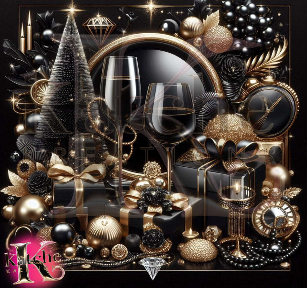 Bring sophistication and elegance to your holiday decor with this Elegant Black & Gold Christmas digital download! This high-quality artwork features a beautifully arranged Christmas scene with black and gold ornaments, wrapped gifts, sparkling wine glasses, and festive decorations. Perfect for creating a refined, modern holiday aesthetic, this design is ideal for projects that call for a touch of glamour.