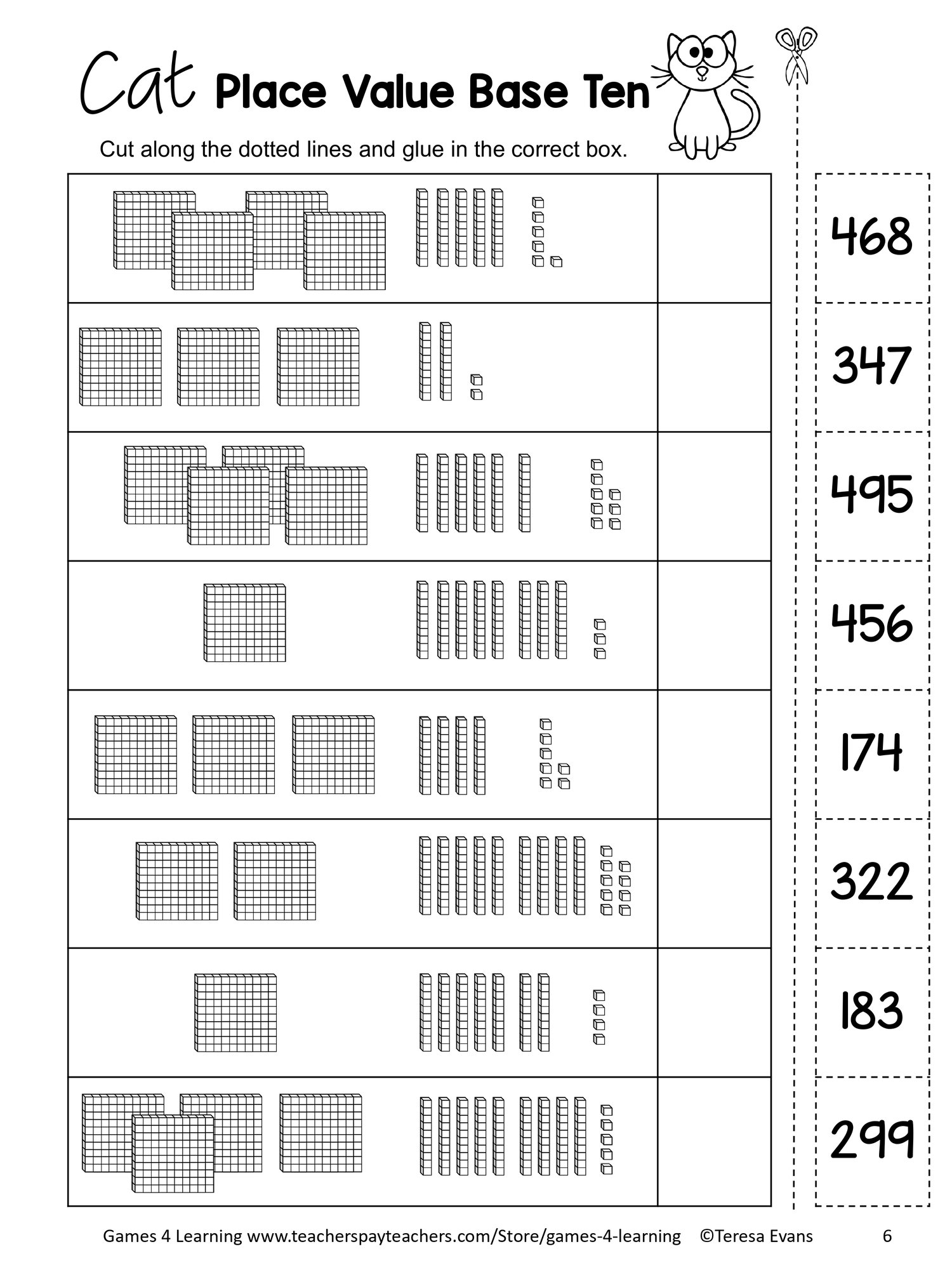 Place Value Worksheets to 1,000 - Cut & Paste Activities w/ Base Ten Blocks etc