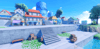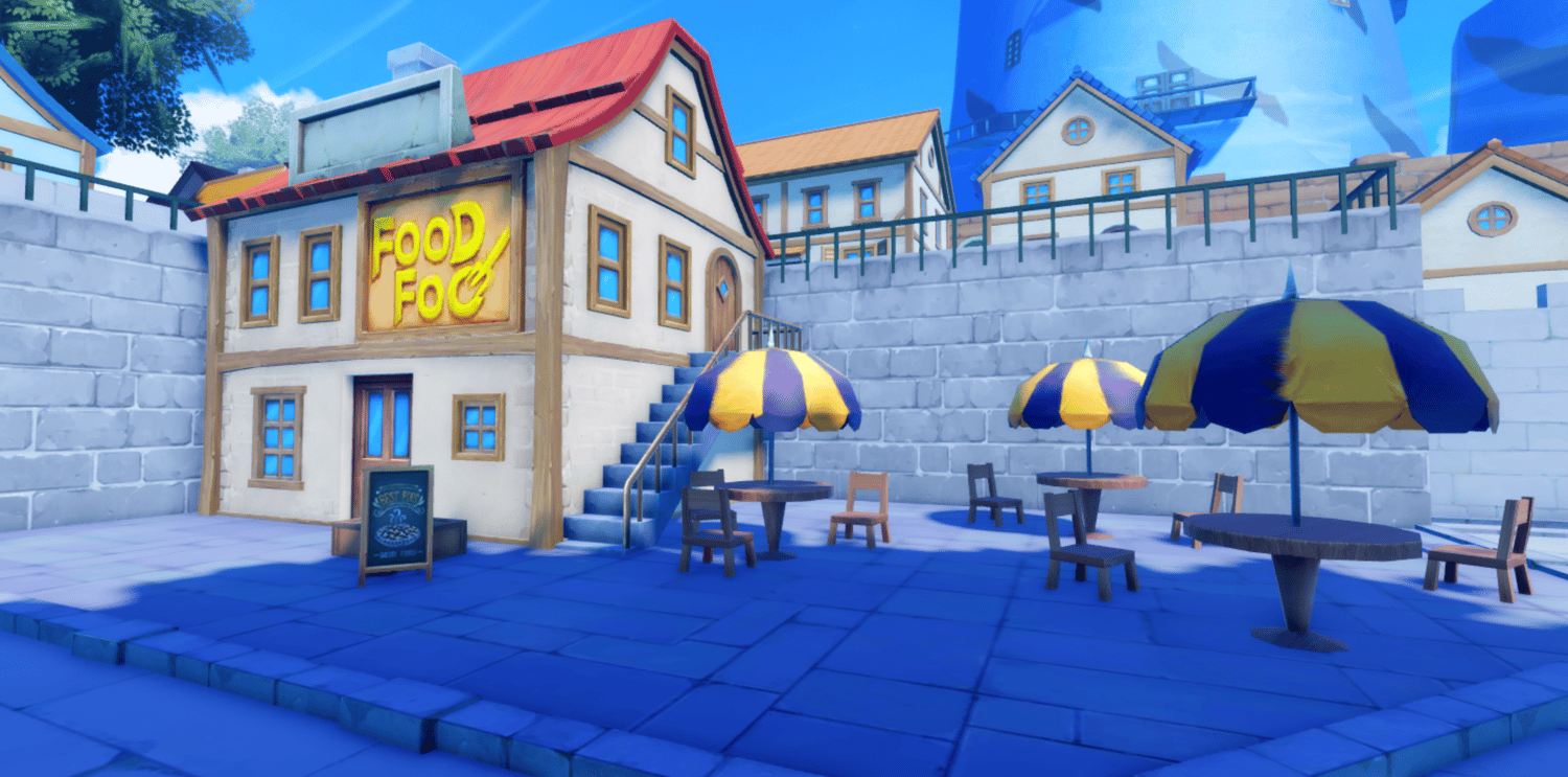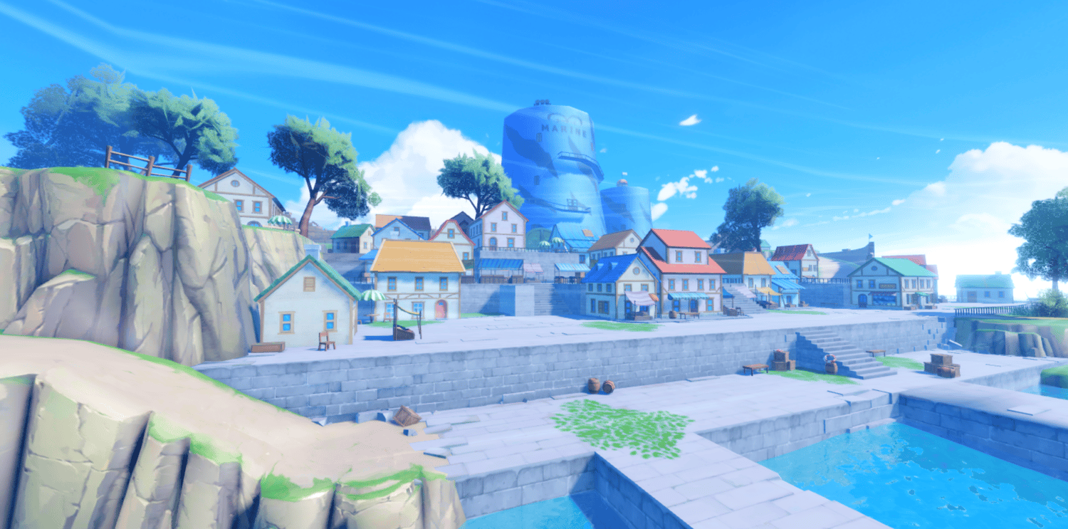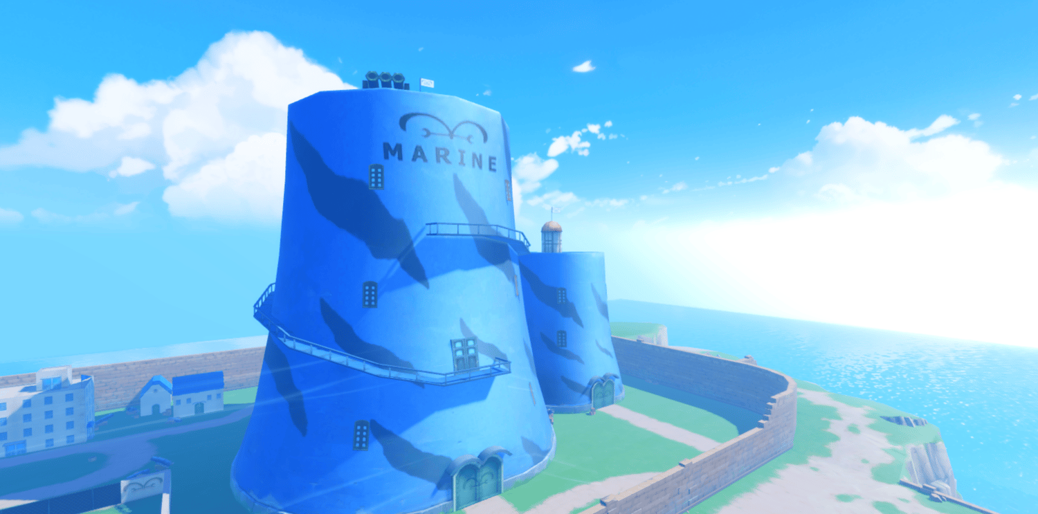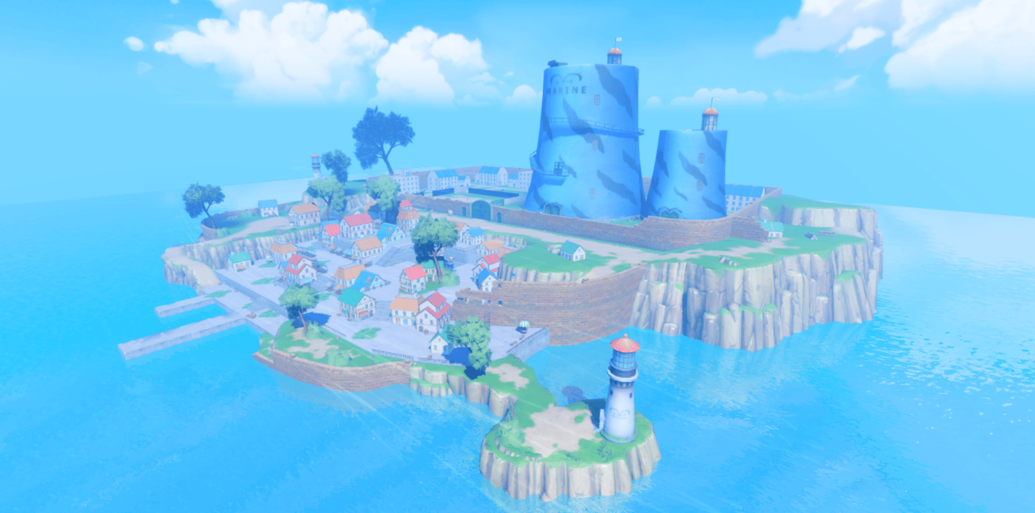 A charming anime-inspired coastal town recreating Shells Town from One Piece, featuring colorful European-style buildings, the iconic Marine base tower, and scenic cliffside views overlooking the ocean. Cobblestone streets wind through lively plazas with outdoor cafes, market stalls, and stone staircases connecting multi-leveled terrain. Bright blue skies, fluffy clouds, and warm saturated lighting create a cheerful, adventurous atmosphere true to the series. The layout supports smooth exploration across shops, docks, and open gathering spaces. Perfect for One Piece fan games, anime RPGs, starter towns, roleplay worlds, or showcase builds.