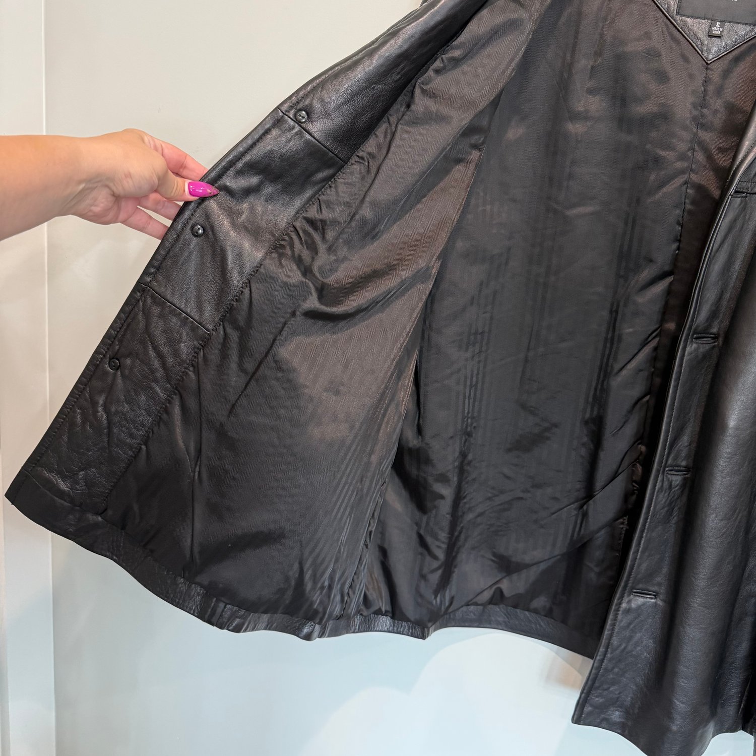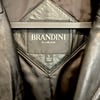 Brandini unisex black leather coat with a button down closure and pockets on the exterior as well as the interior.