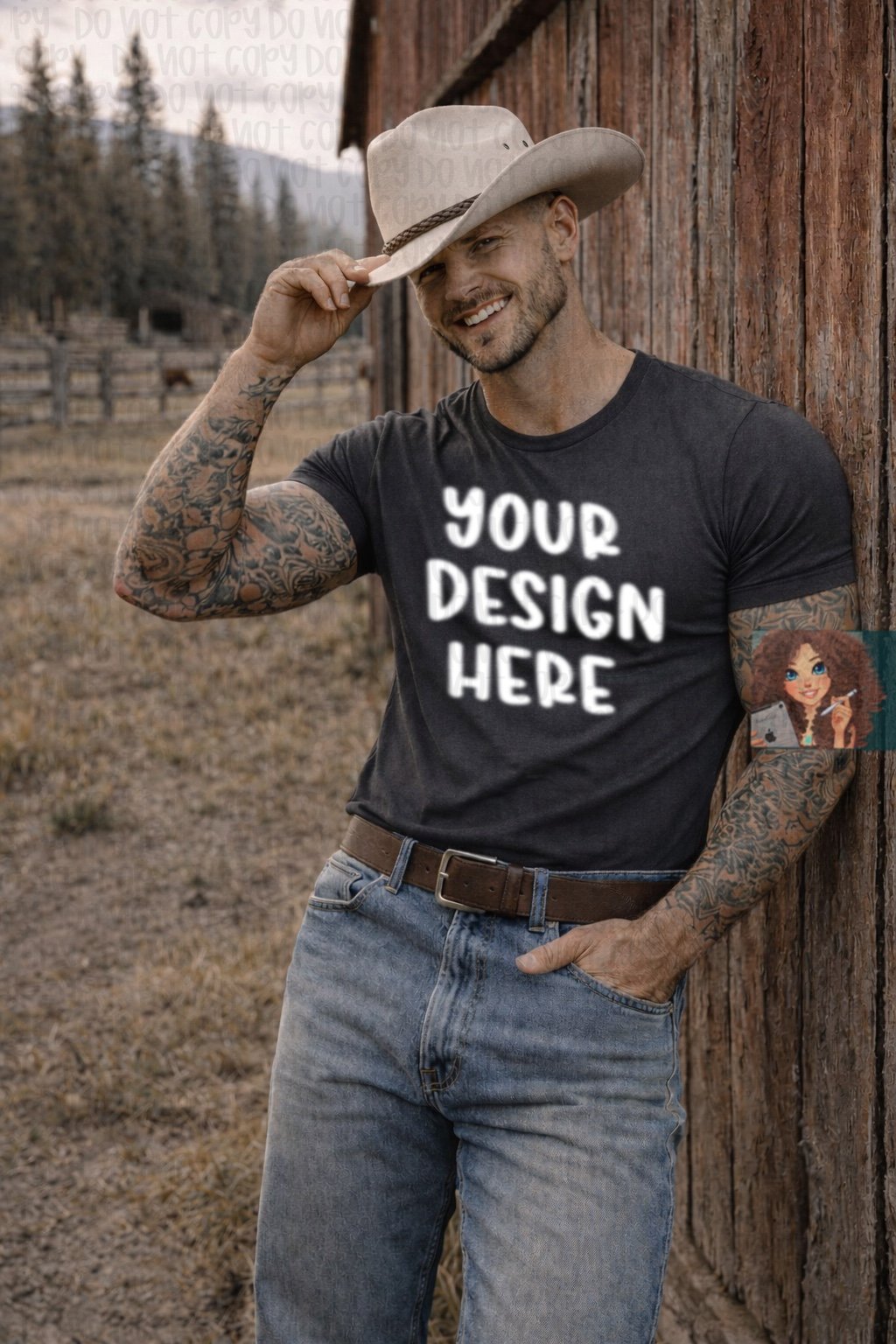 Men’s G5000 charcoal Beau leaning on barn