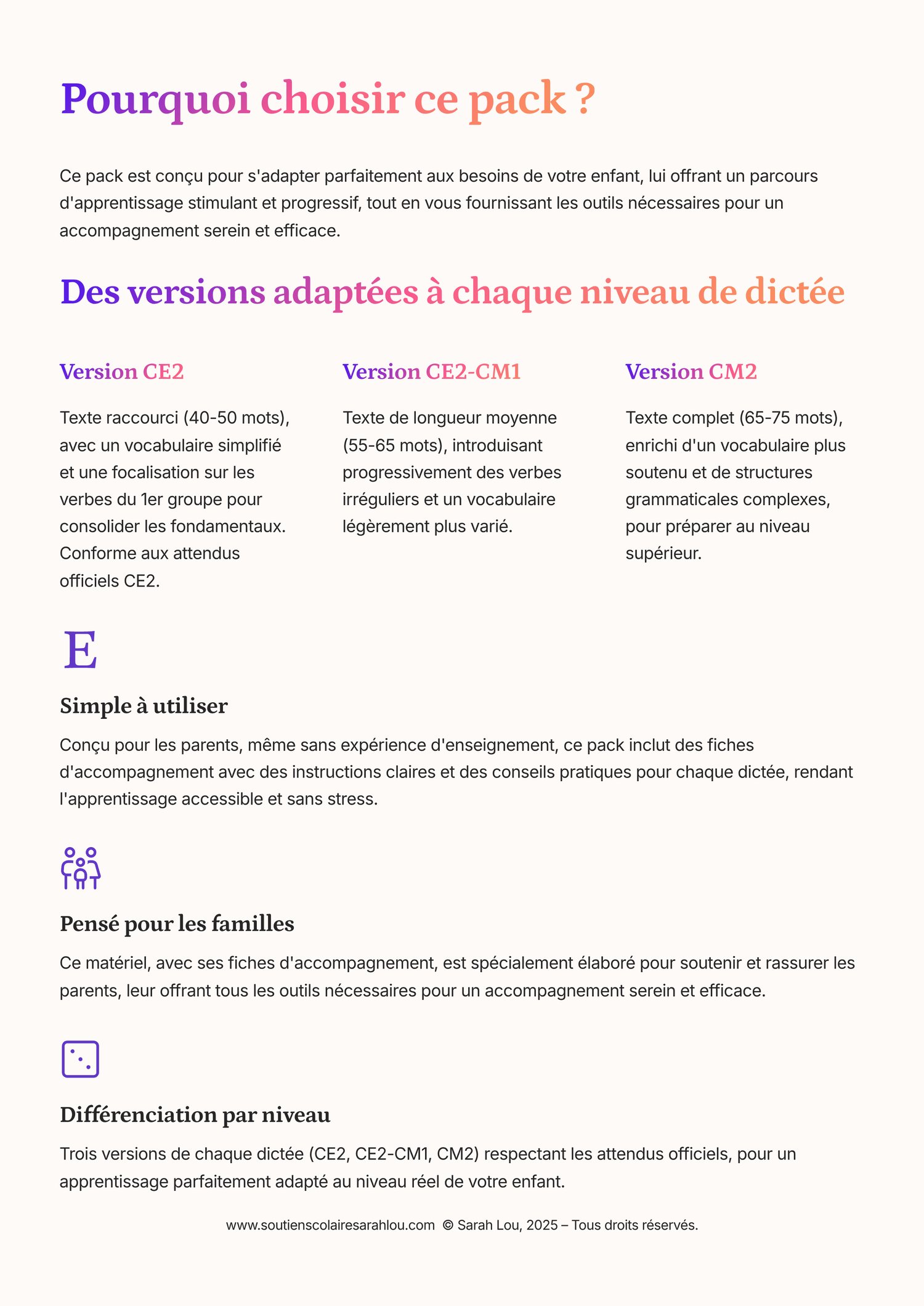 ✅ 5 dictées différenciées, chacune en 3 niveaux de difficulté (facile / moyen / expert) + exercices de conjugaison