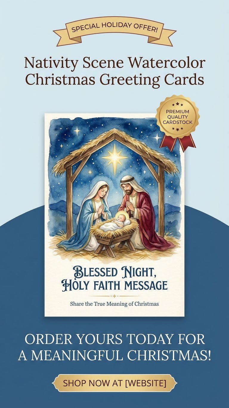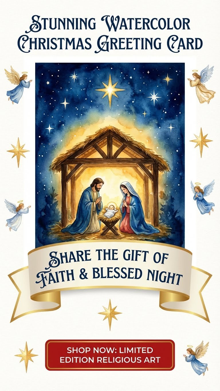 Celebrate the true spirit of Christmas with this beautiful watercolor Nativity greeting card ✝️💫. Featuring the Holy Family under a blessed starry night 🌟, this artwork radiates faith, love, peace, and divine blessings 🤍🙏. Soft watercolor textures 🎨 and warm heavenly tones create an emotional, spiritual connection that touches the heart ❤️. Perfect for Christmas wishes, religious gifting 🎁, church greetings, or festive décor—this card shares the miracle of Christ’s birth and spreads timeless Christmas joy 🎄✨.
