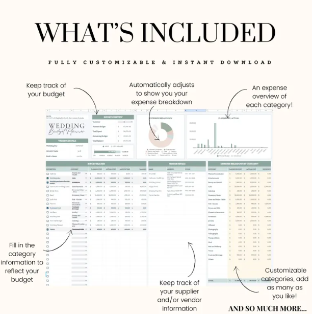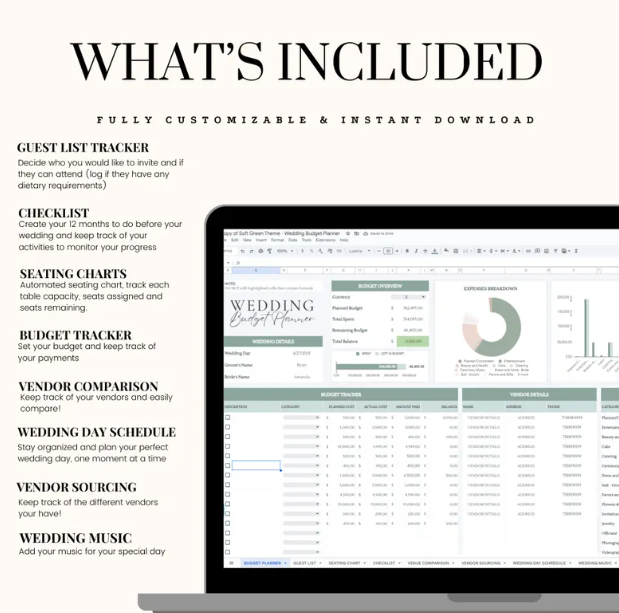 •Vendor Contact & Payment Tracker: Keep all your vendor details and payments organized in one place.
