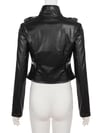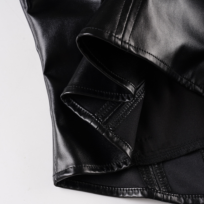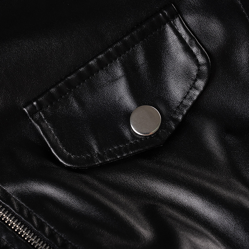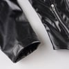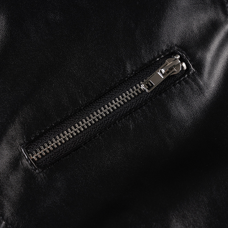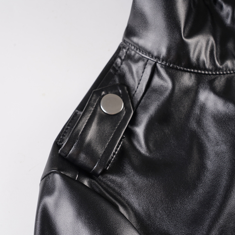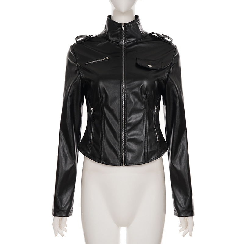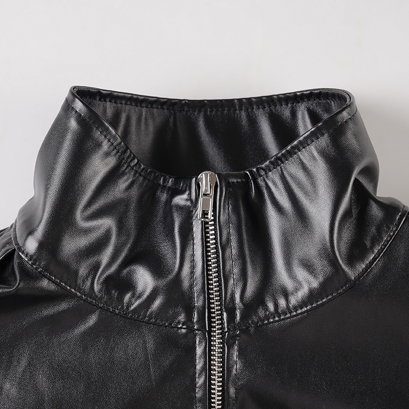 Retro punk style stand-up collar zipper waist-cinching black slim leather jacket