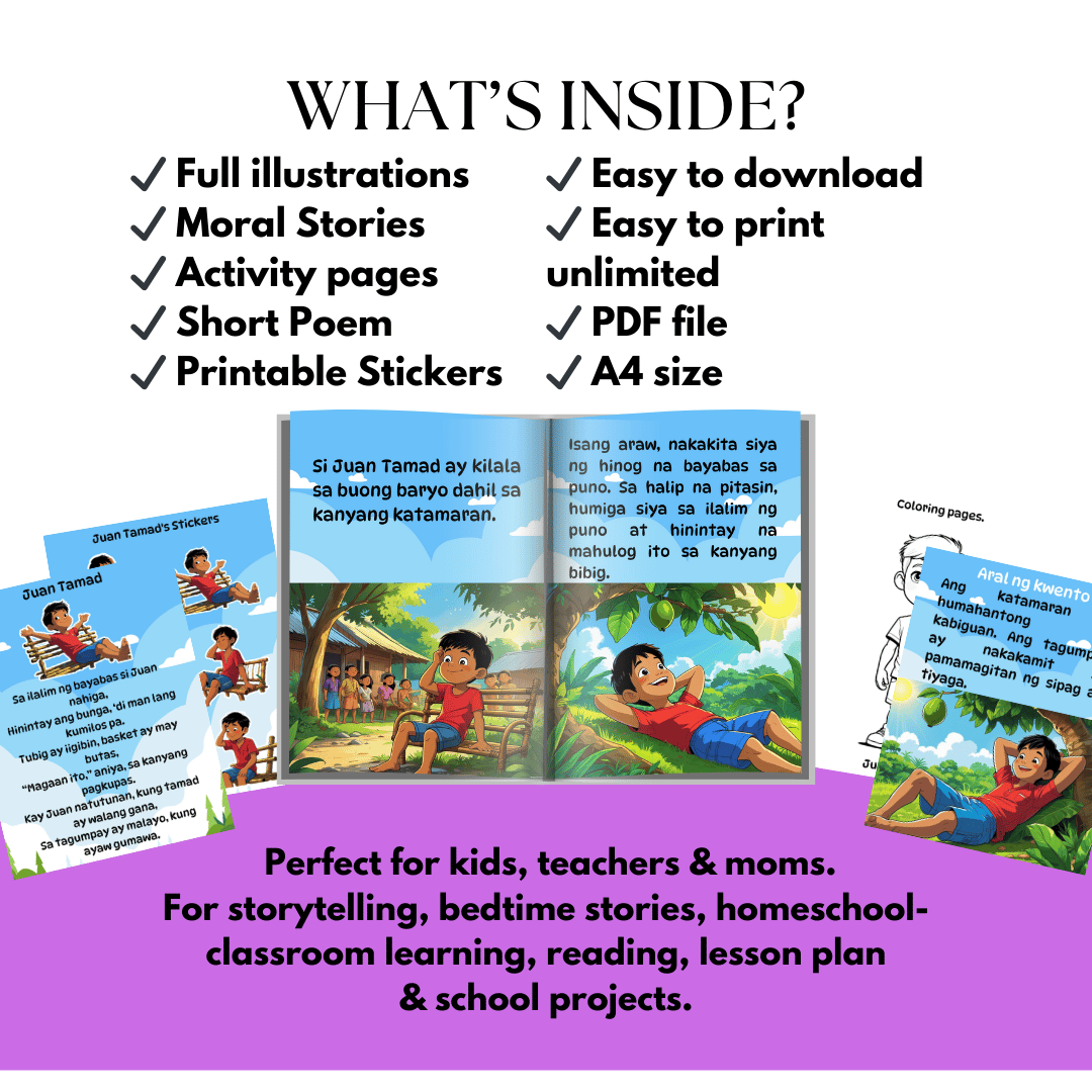 Isang klasikong alamat ng Pilipino tungkol kay Juan, ang tamad ngunit tusong batang lalaki na laging naghahanap ng madaling daan kaysa magtrabaho ng mabuti. Sa pamamagitan ng kanyang nakakatawa at minsang katawa-tawang mga kilos, natututo ang mga bata tungkol sa kahalagahan ng responsibilidad, pagsusumikap, at paggawa ng matalinong desisyon. Isang masaya ngunit makabuluhang kwento na madaling matandaan ng mga bata. 🇵🇭📖